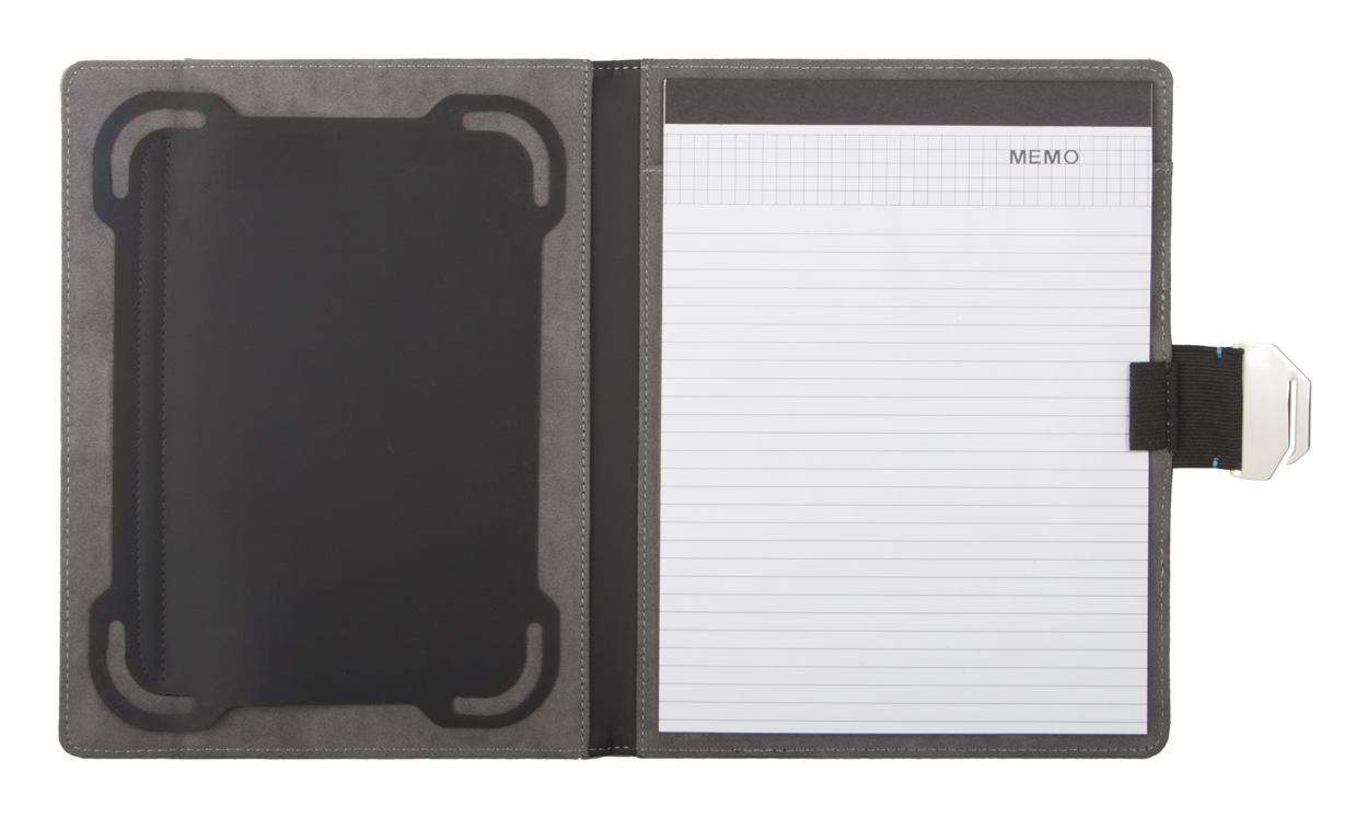PU lederen en polyester documenten map met iPad® houder. Notitieboek met 20 gelinieerde pagina's en metalen buckle. Compatible met iPad® en iPad® Air.
