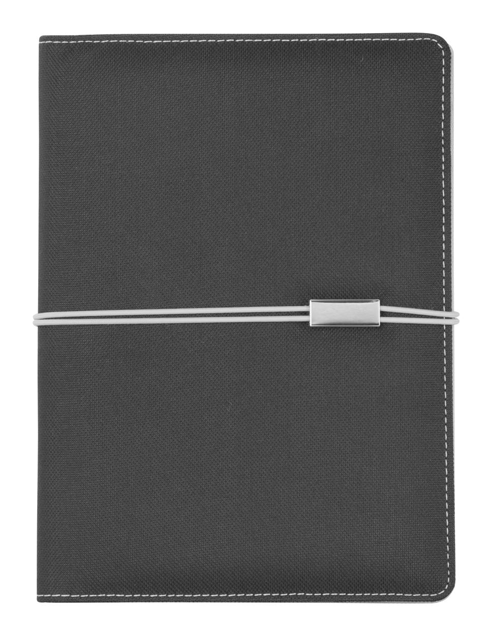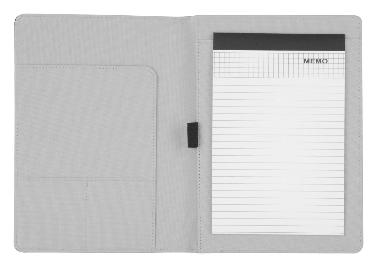 A5 documenten map met notitieboek, 20 gelinieerde pagina's. Sluiting met rubberen band met metalen plaat. 600D polyester.