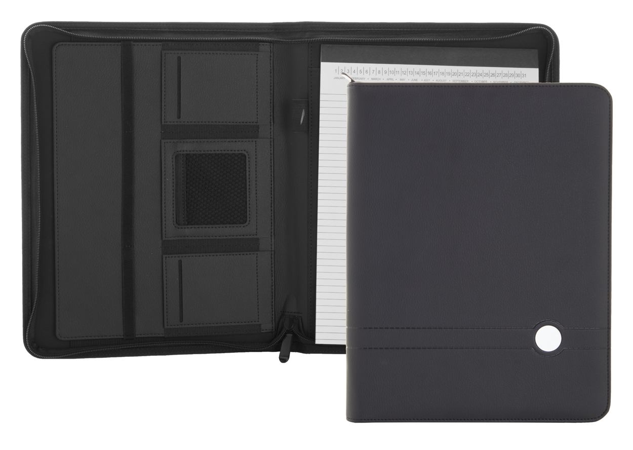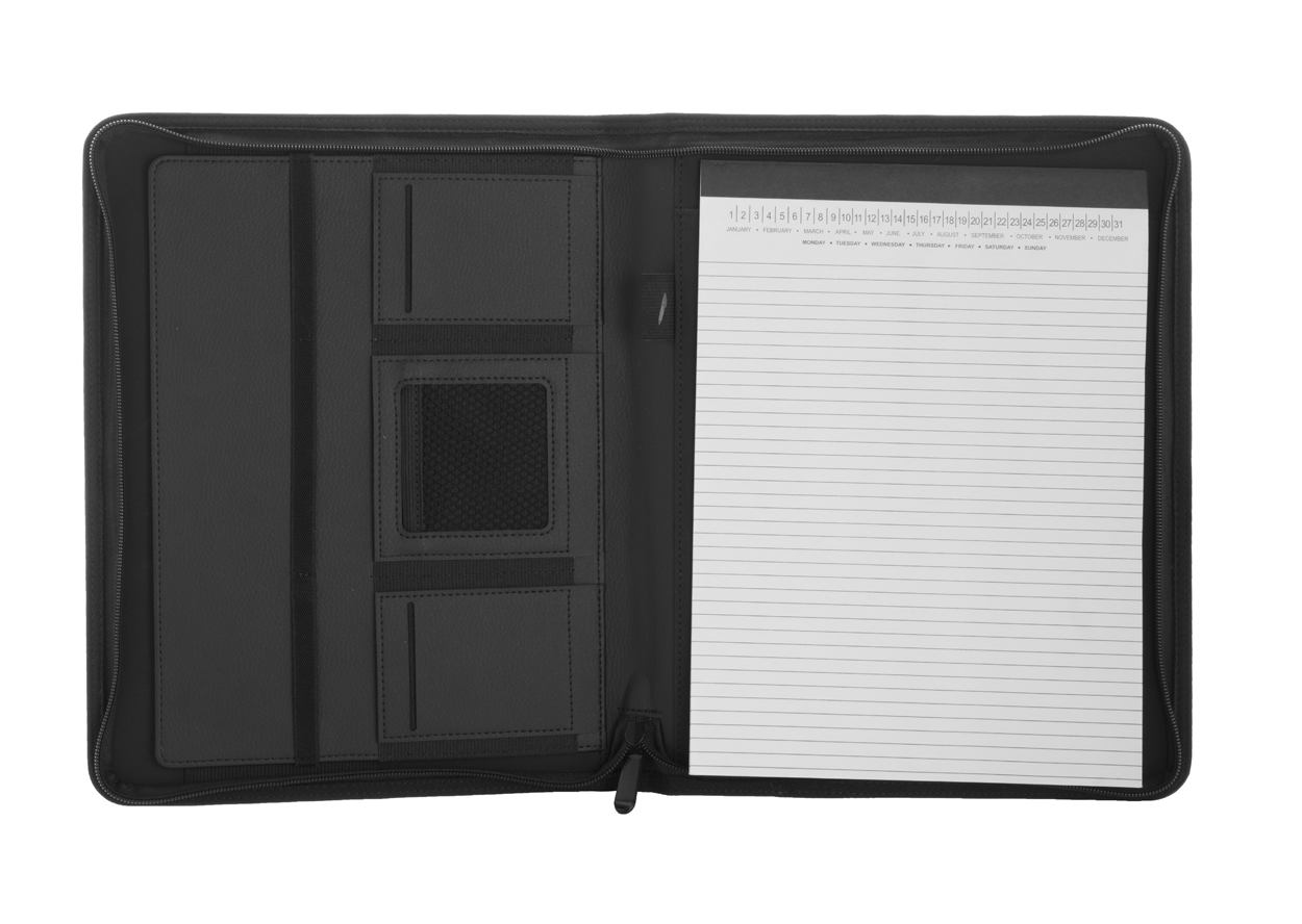 A4-formaat documentmap van PU leder en metalen inlay in the omslag. Met rits, notitieblok van 20 gelinieerde bladen, visitekaart-, en penhouder.