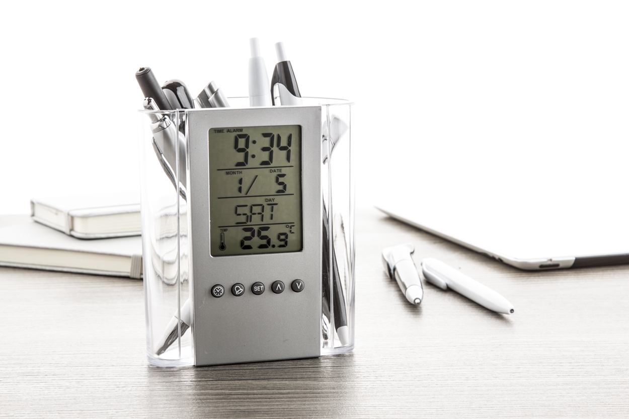 Transparant plastic pennenhouder met digitaal display met thermometer, tijd en kalender. Inclusief batterij.