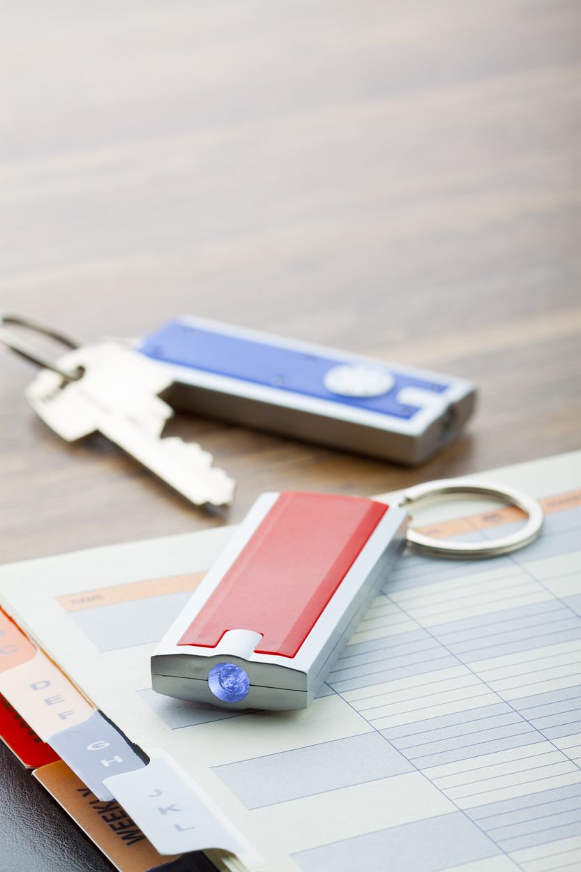 Plastic sleutelhanger met LED zaklampje geleverd met drie knoopcelbatterijen.