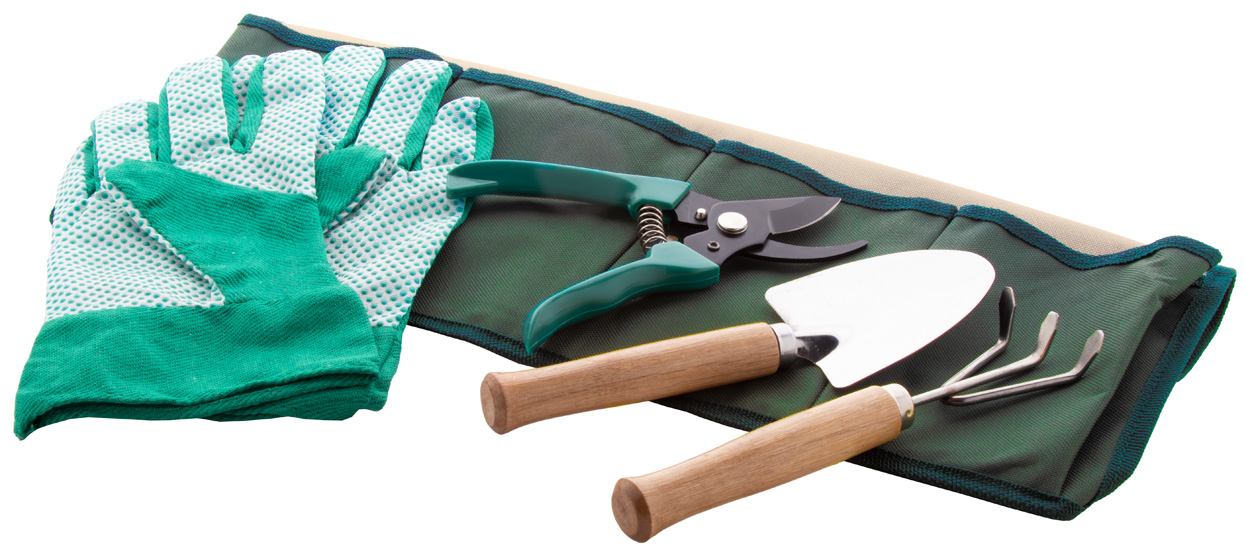 Tuingereedschap set in nylon schort. Inclusief snoeischaar, hand hark, troffel en één paar handschoenen.