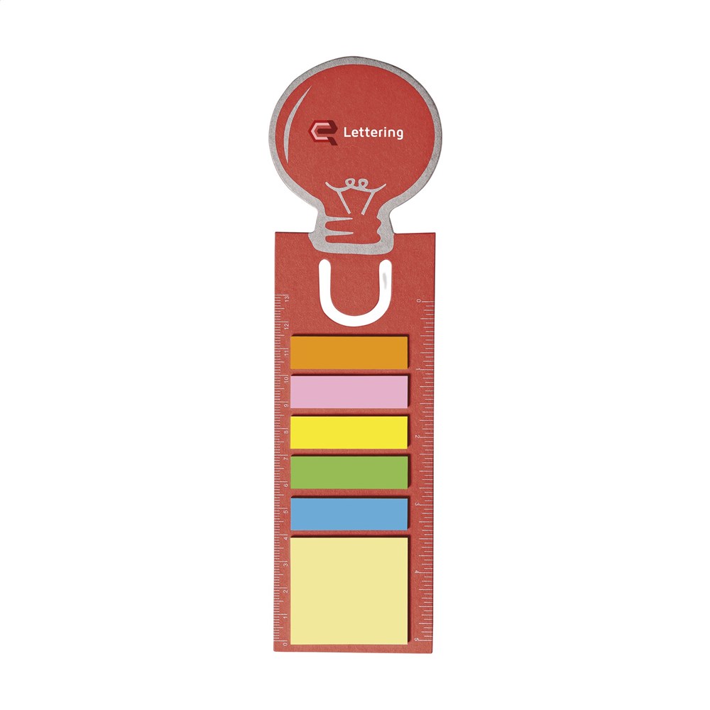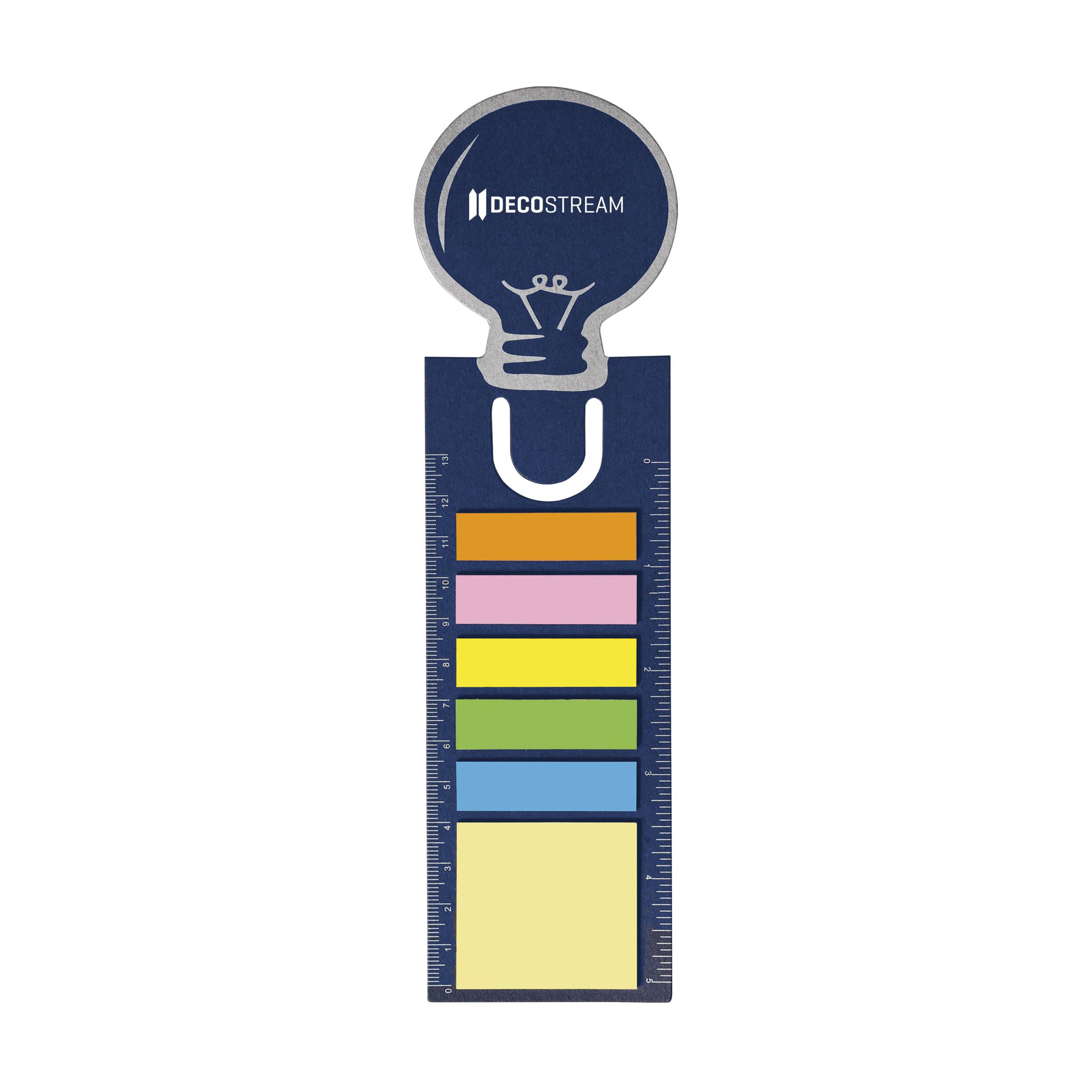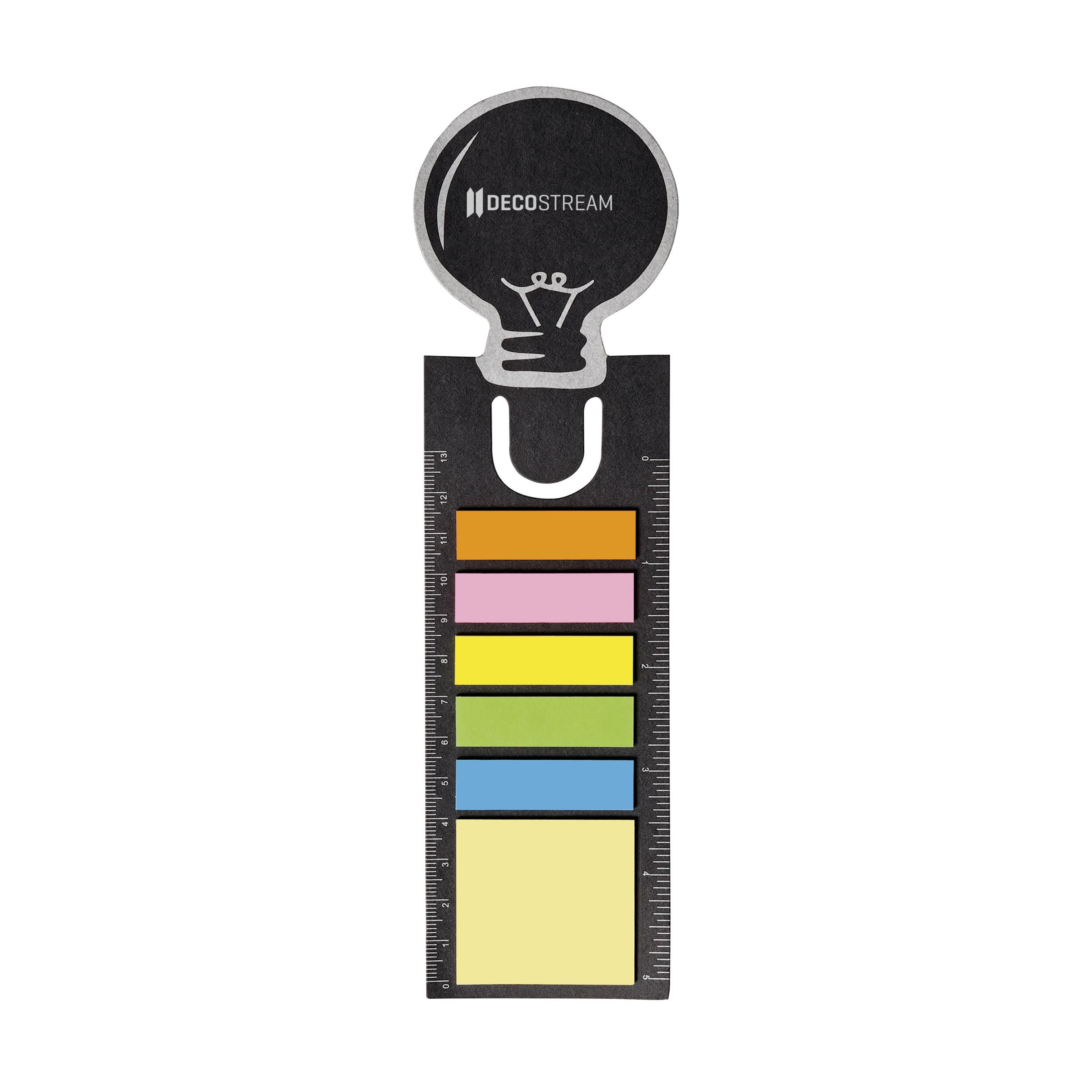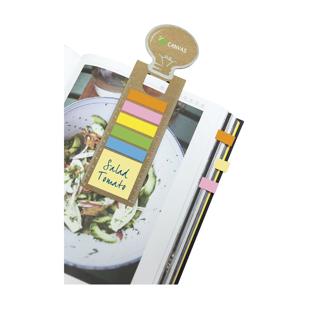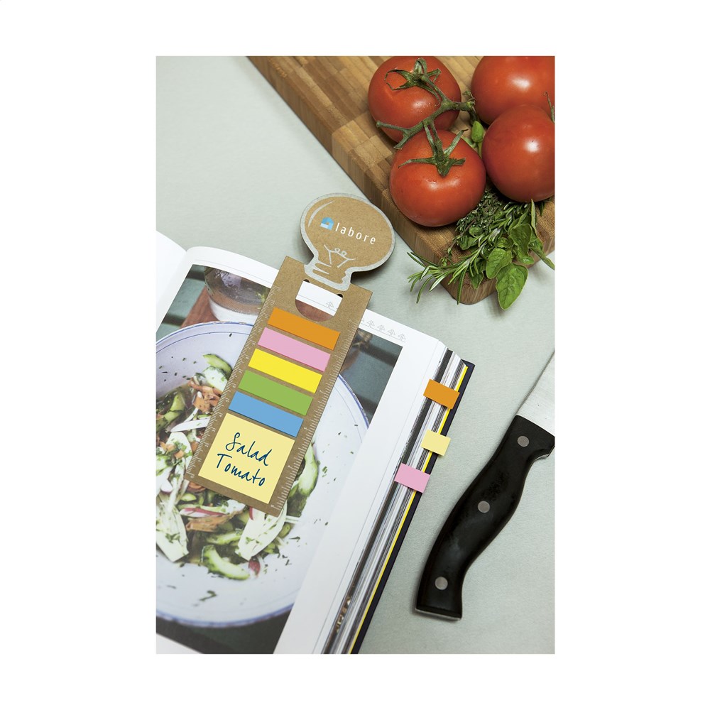 Boekenlegger van stevig karton met 15 zelfklevende memovelletjes, 75 beschrijfbare markeerstickers en liniaal (lengte 13 cm/5 inches).