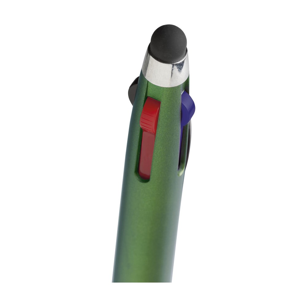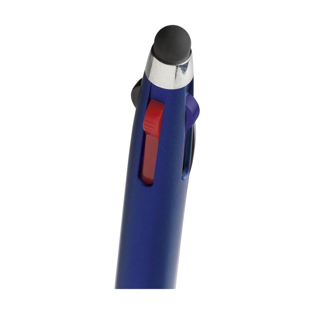 3-kleuren balpen met rubberen top/pointer voor het bedienen van touchscreens (zoals iPhone/iPad), metallic look houder, zilverkleurig accent en rubberen voorstuk. Voorzien van een blauwe, rode en zwarte vulling.