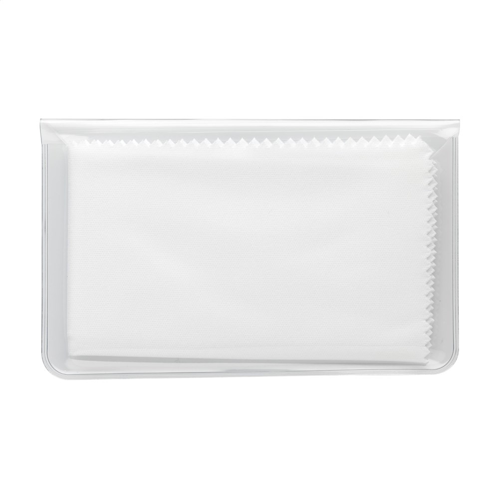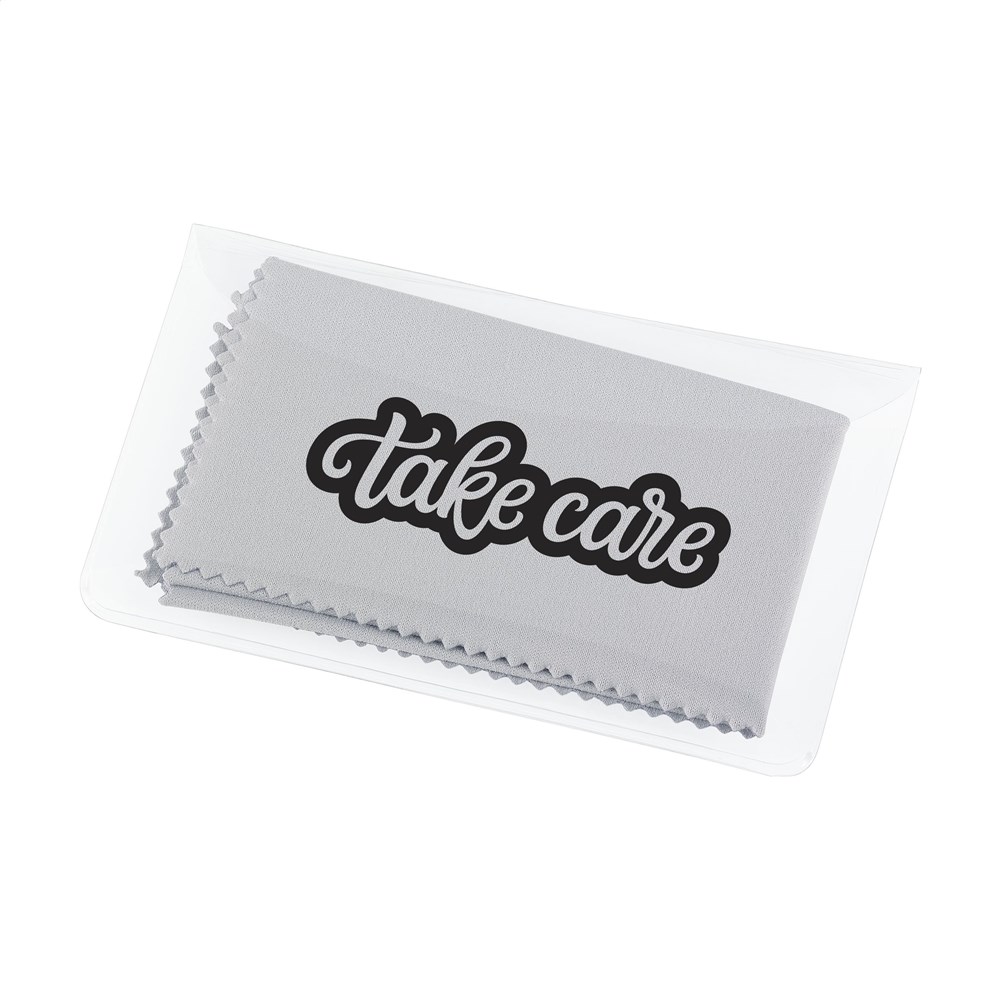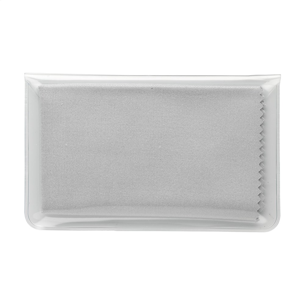 Praktisch microfiber schoonmaakdoekje (18 x 15 cm) in compact, transparant kunststof etui. Opdruk standaard op etui.