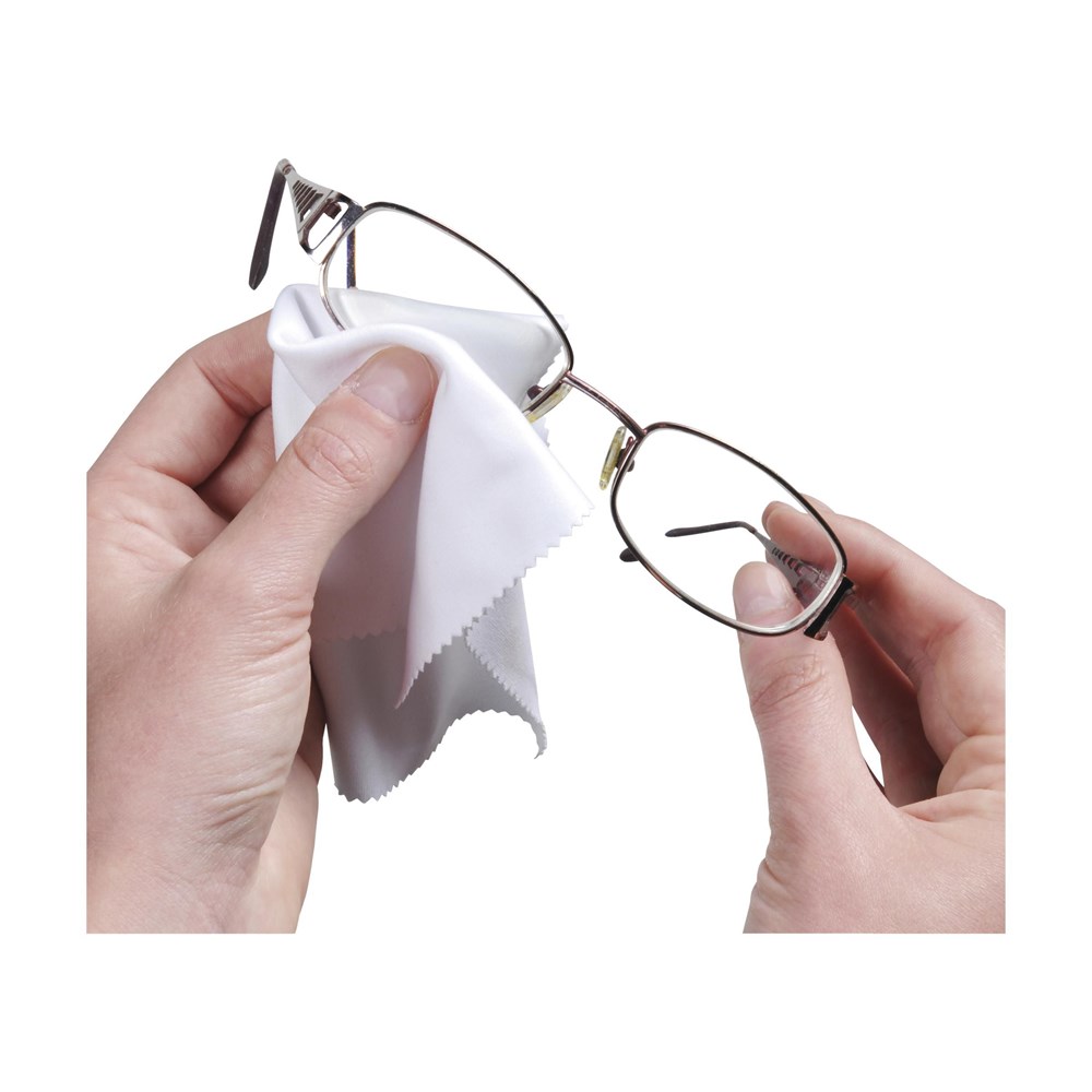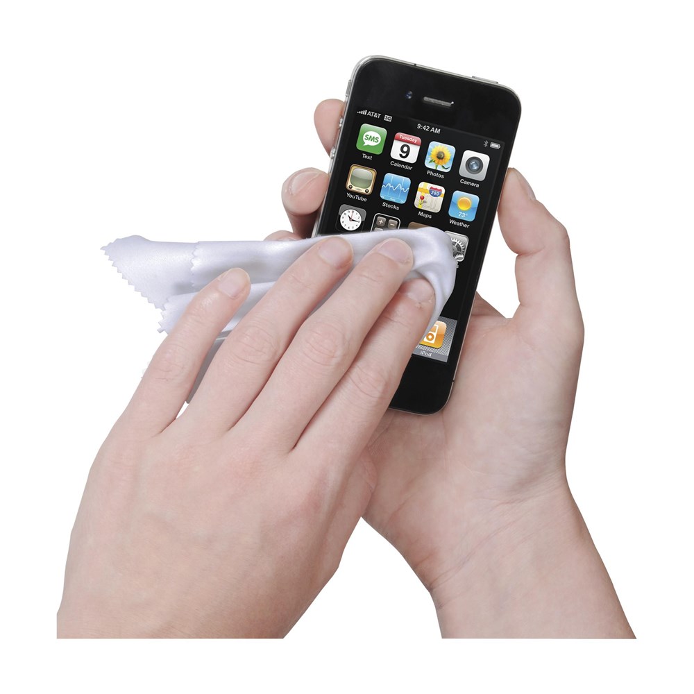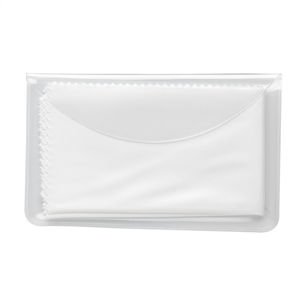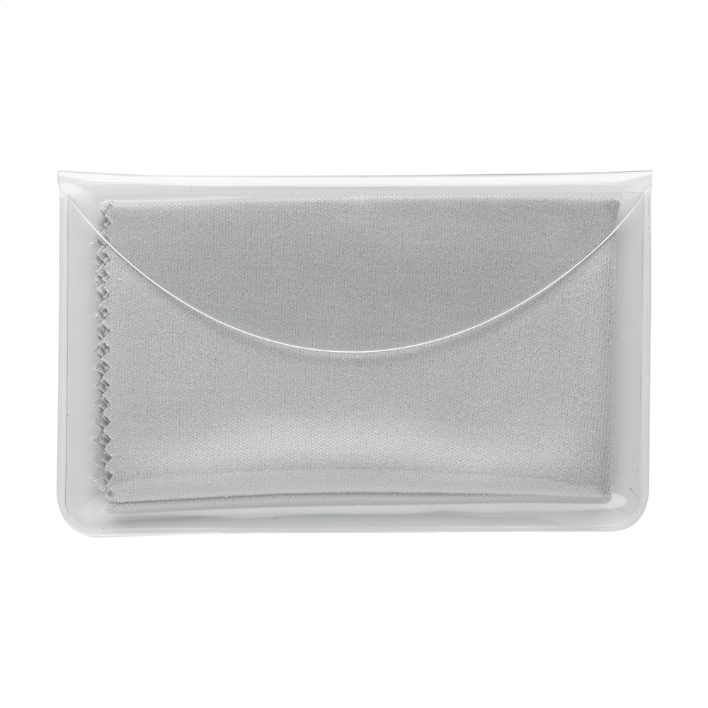 Praktisch microfiber schoonmaakdoekje (18 x 15 cm) in compact, transparant kunststof etui. Opdruk standaard op etui.