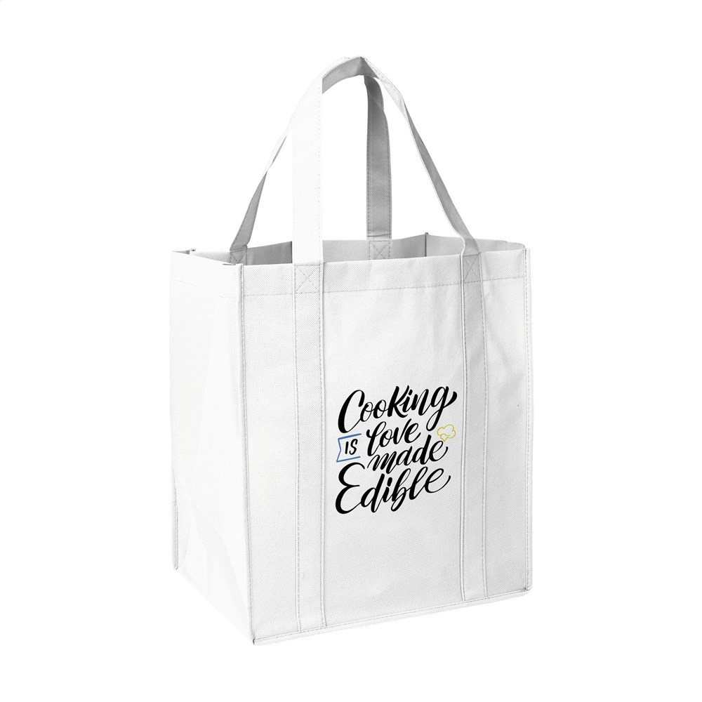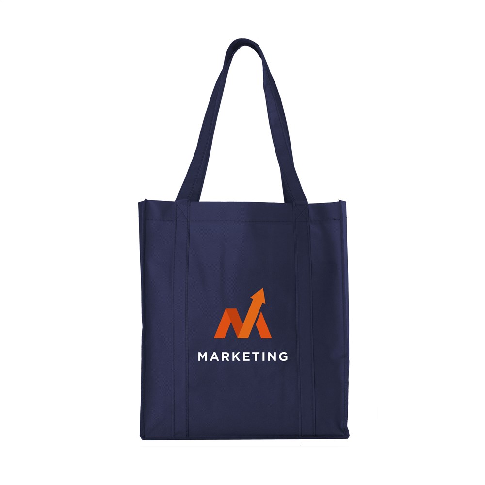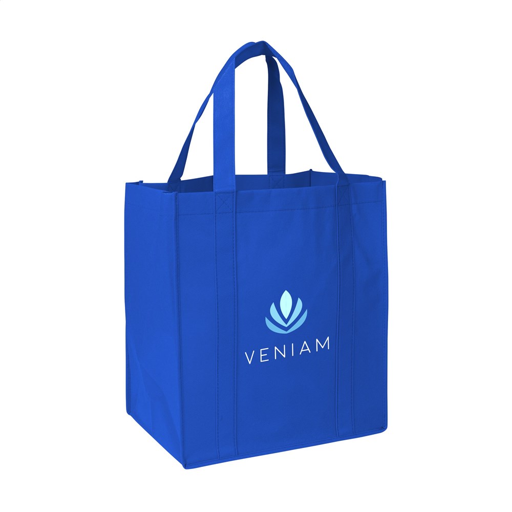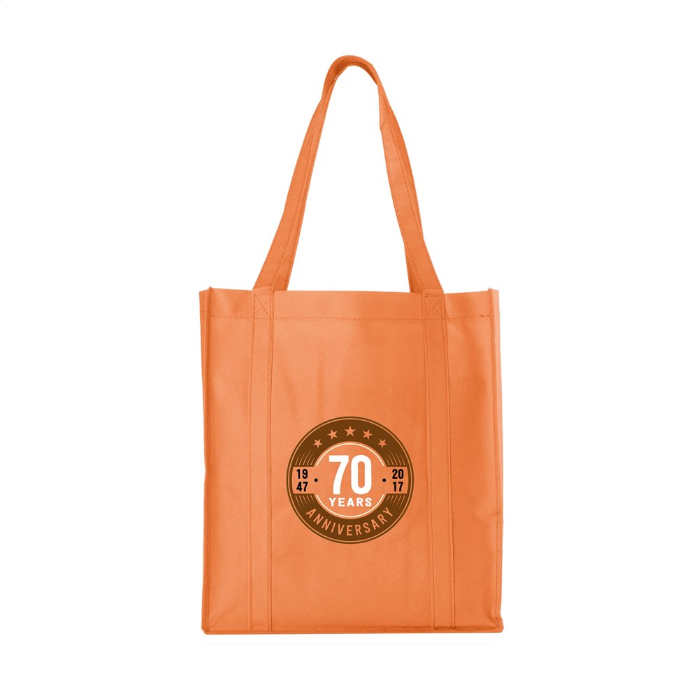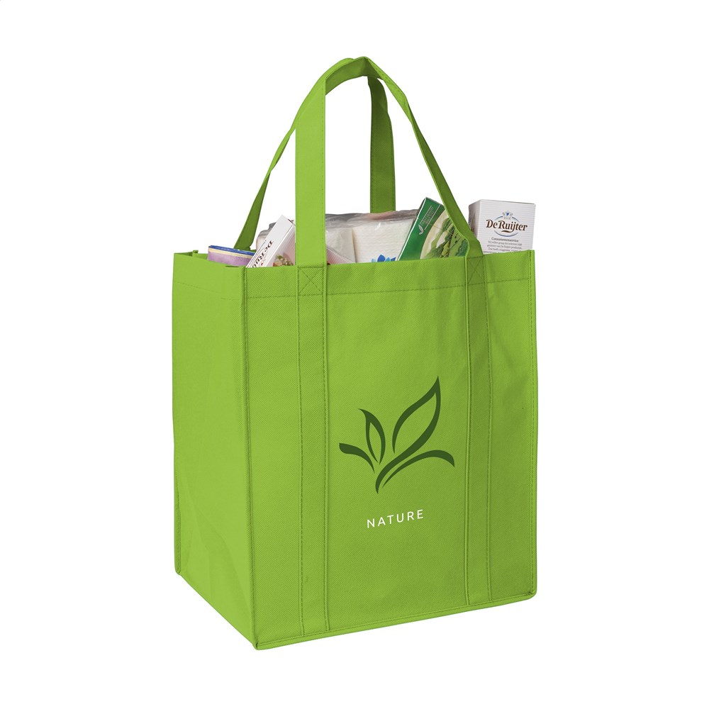 Praktische, extra ruime nonwoven (80 g/m²) winkeltas: een superlichte en sterke kunstvezelstof. Met verstevigde bodem, draaglussen en extra ophanglus aan binnenzijde.
