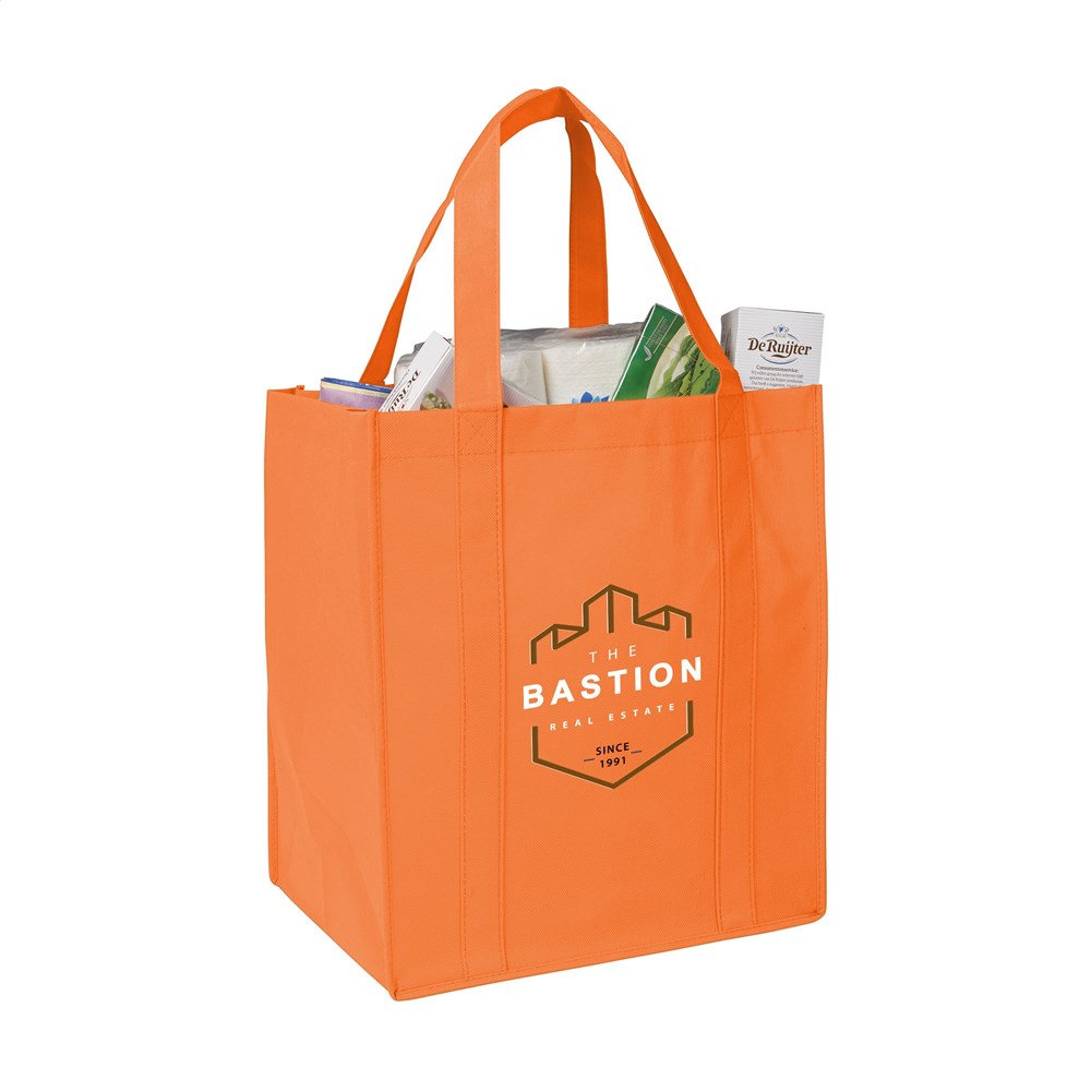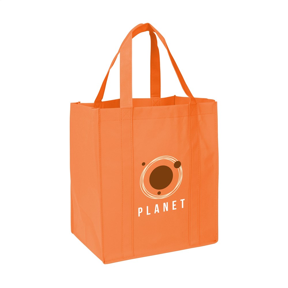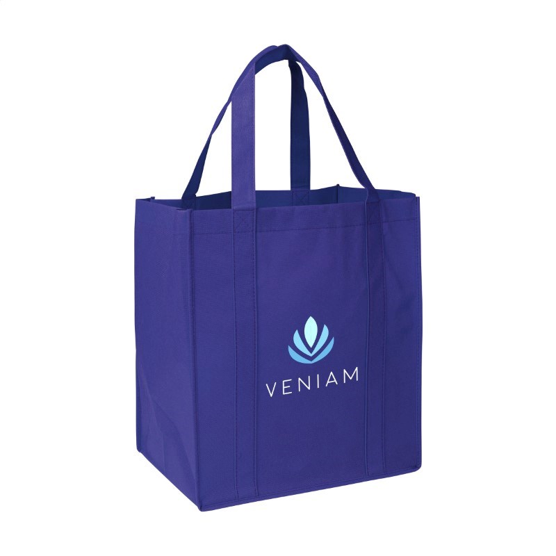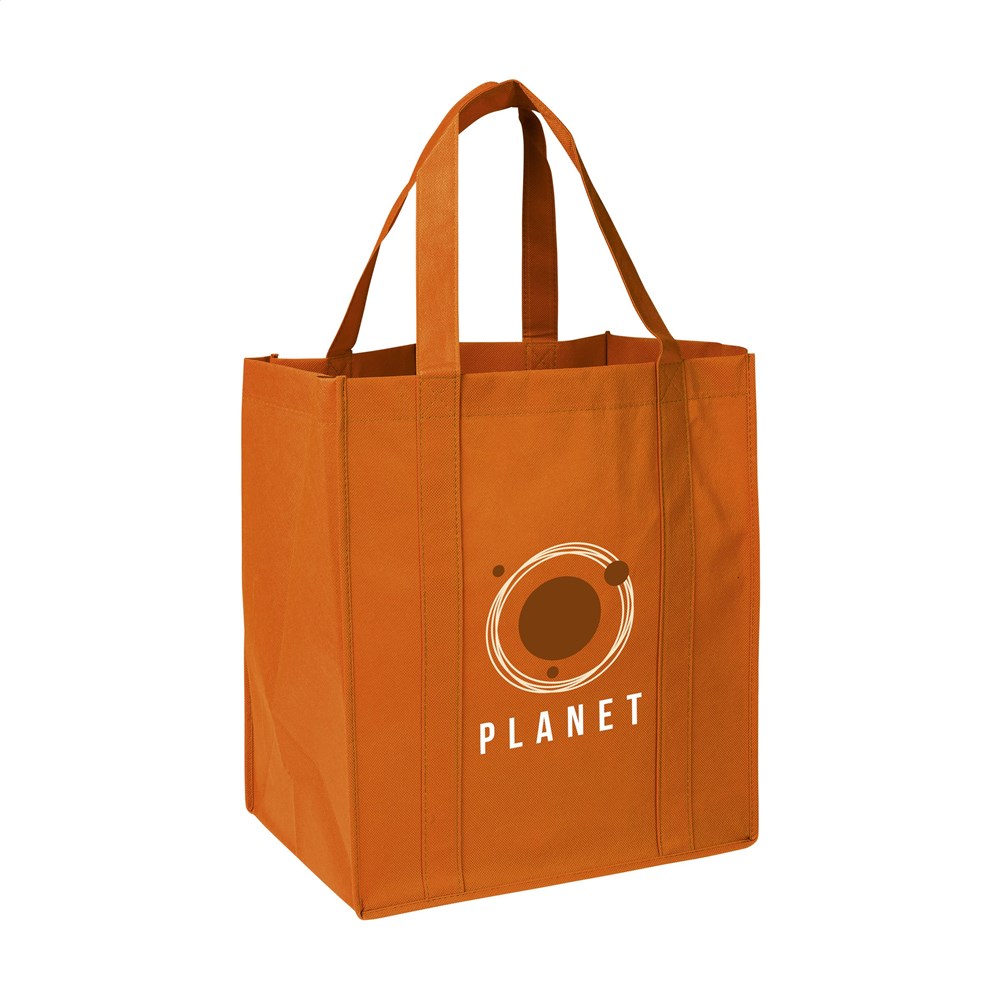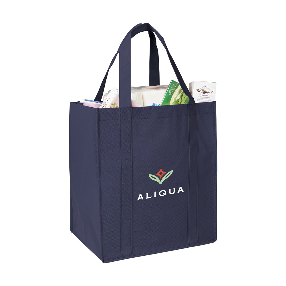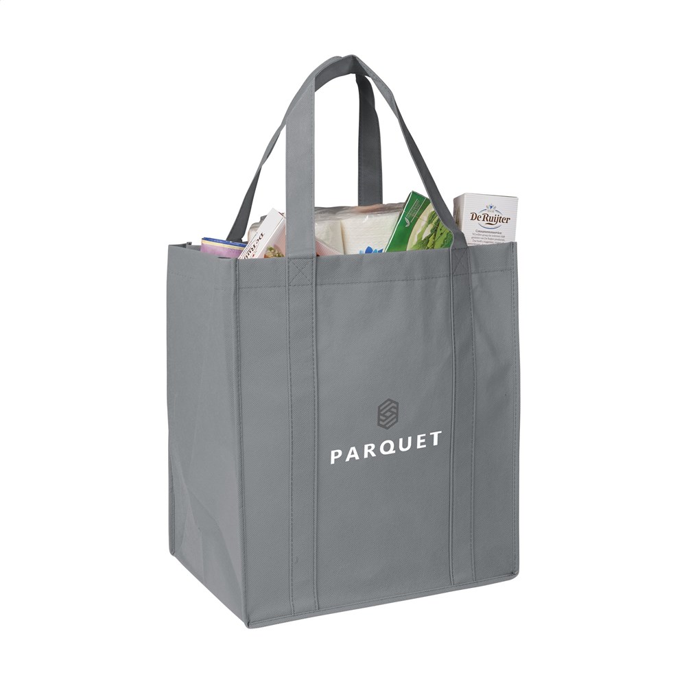 Praktische, extra ruime nonwoven (80 g/m²) winkeltas: een superlichte en sterke kunstvezelstof. Met verstevigde bodem, draaglussen en extra ophanglus aan binnenzijde.