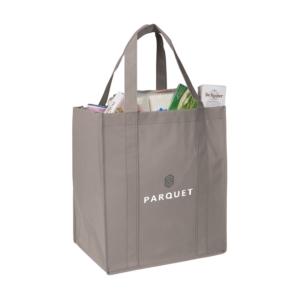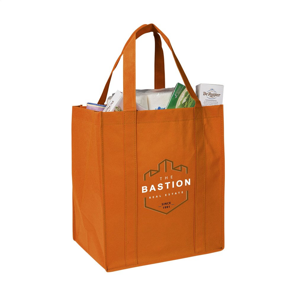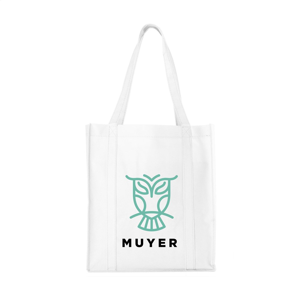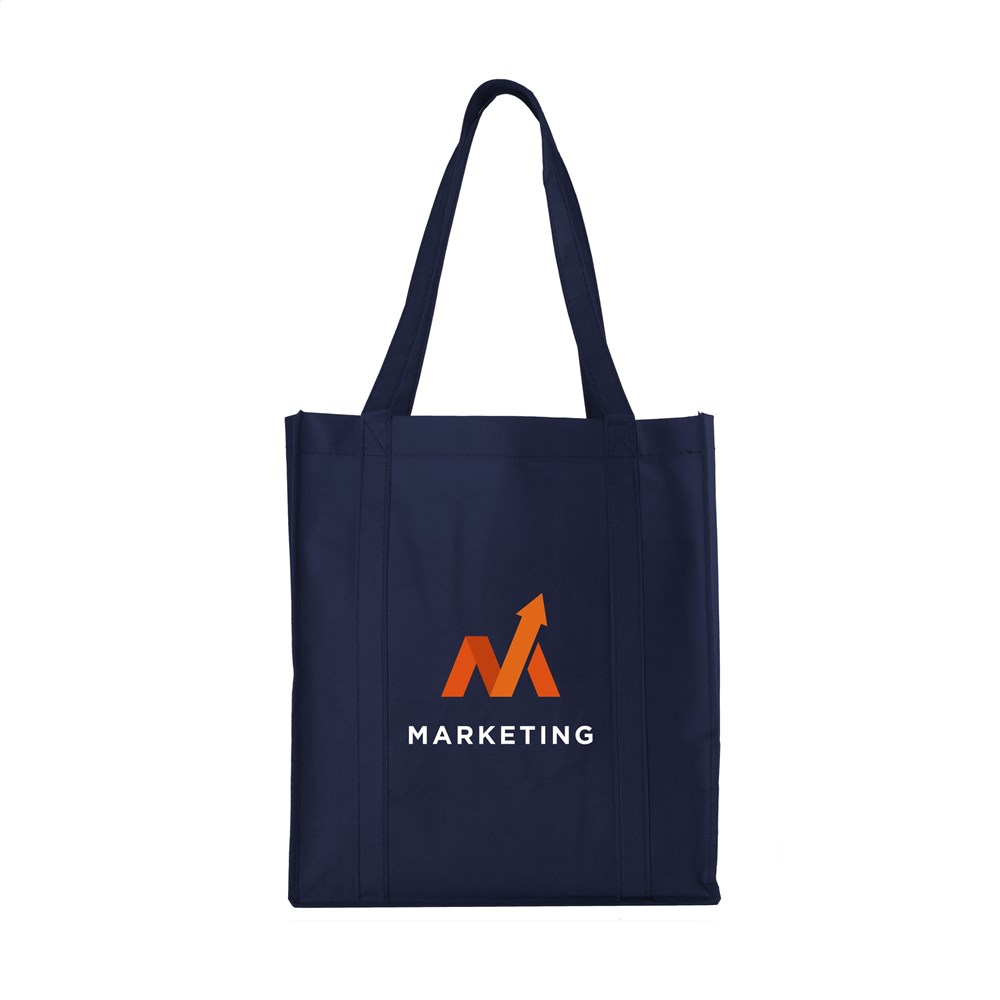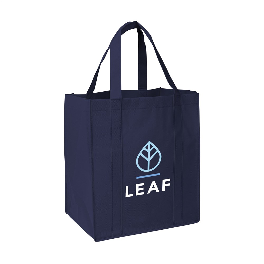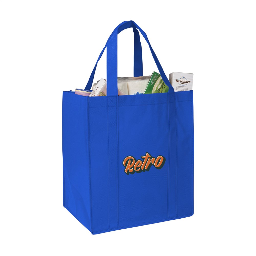 Praktische, extra ruime nonwoven (80 g/m²) winkeltas: een superlichte en sterke kunstvezelstof. Met verstevigde bodem, draaglussen en extra ophanglus aan binnenzijde.