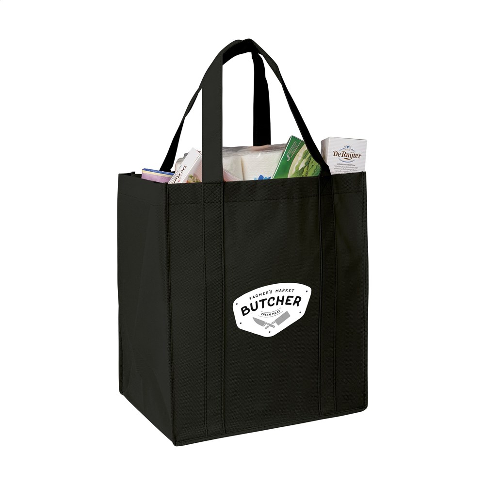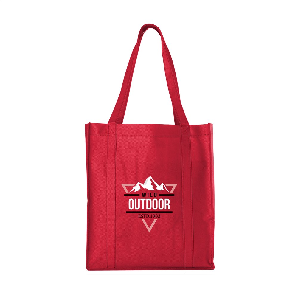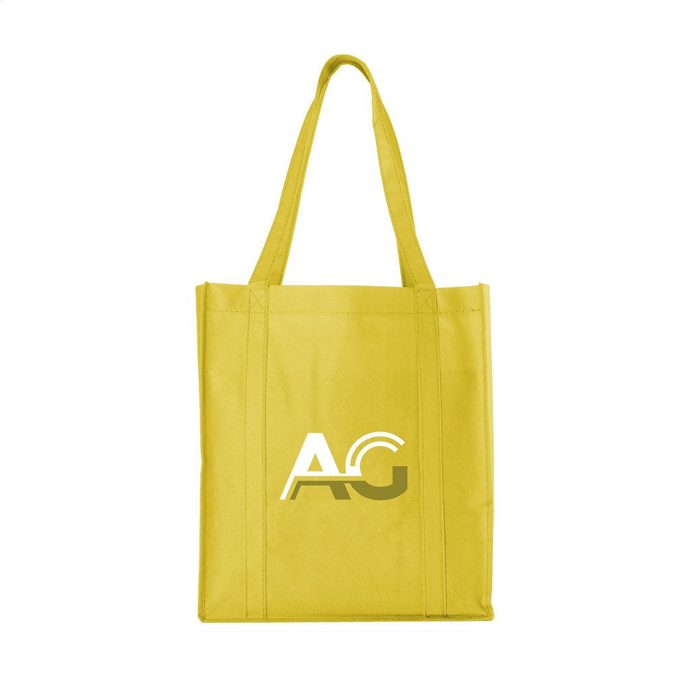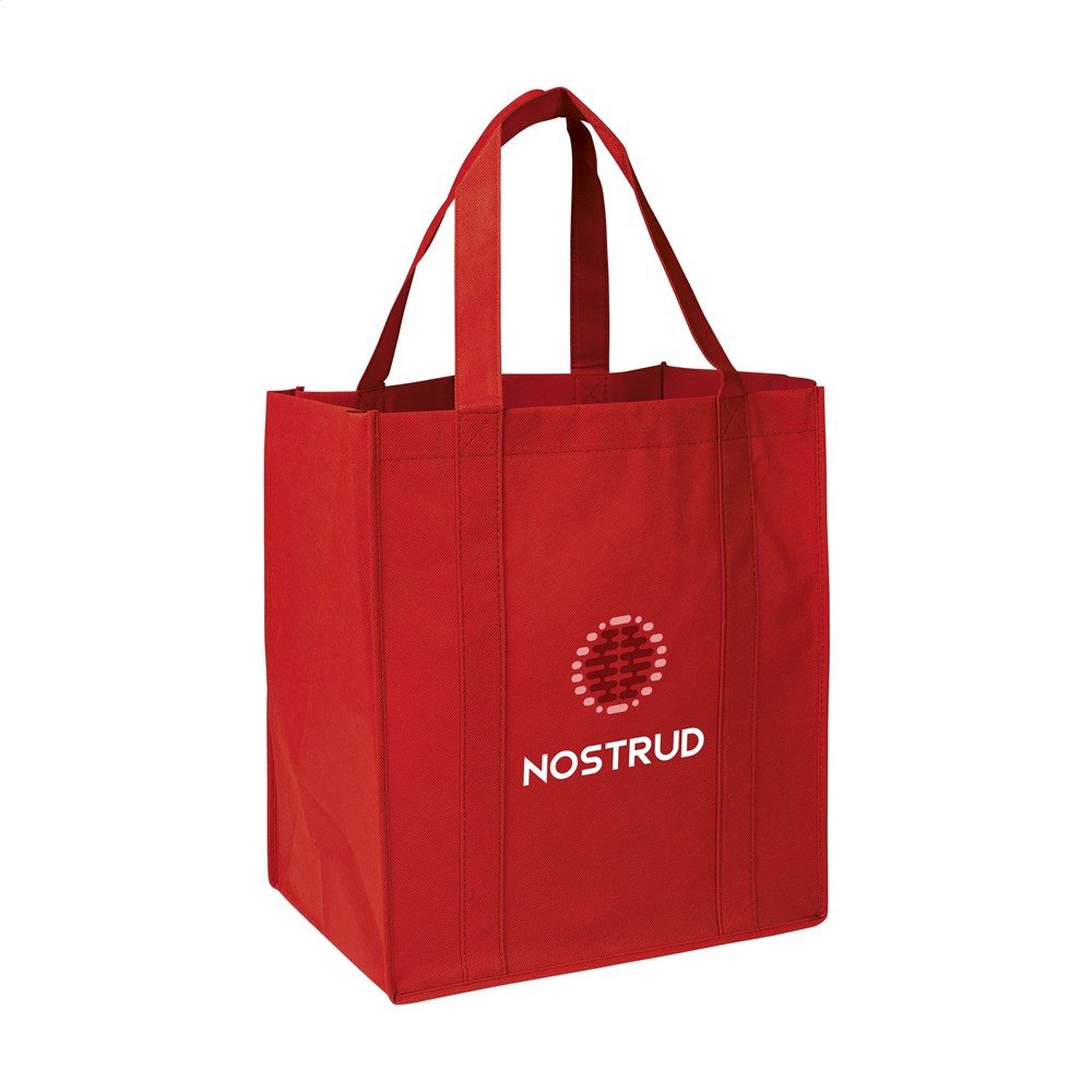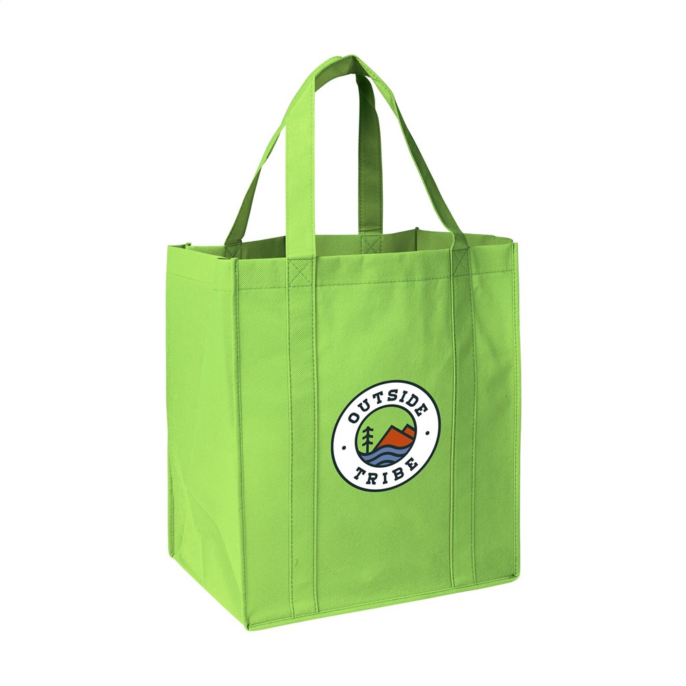 Praktische, extra ruime nonwoven (80 g/m²) winkeltas: een superlichte en sterke kunstvezelstof. Met verstevigde bodem, draaglussen en extra ophanglus aan binnenzijde.