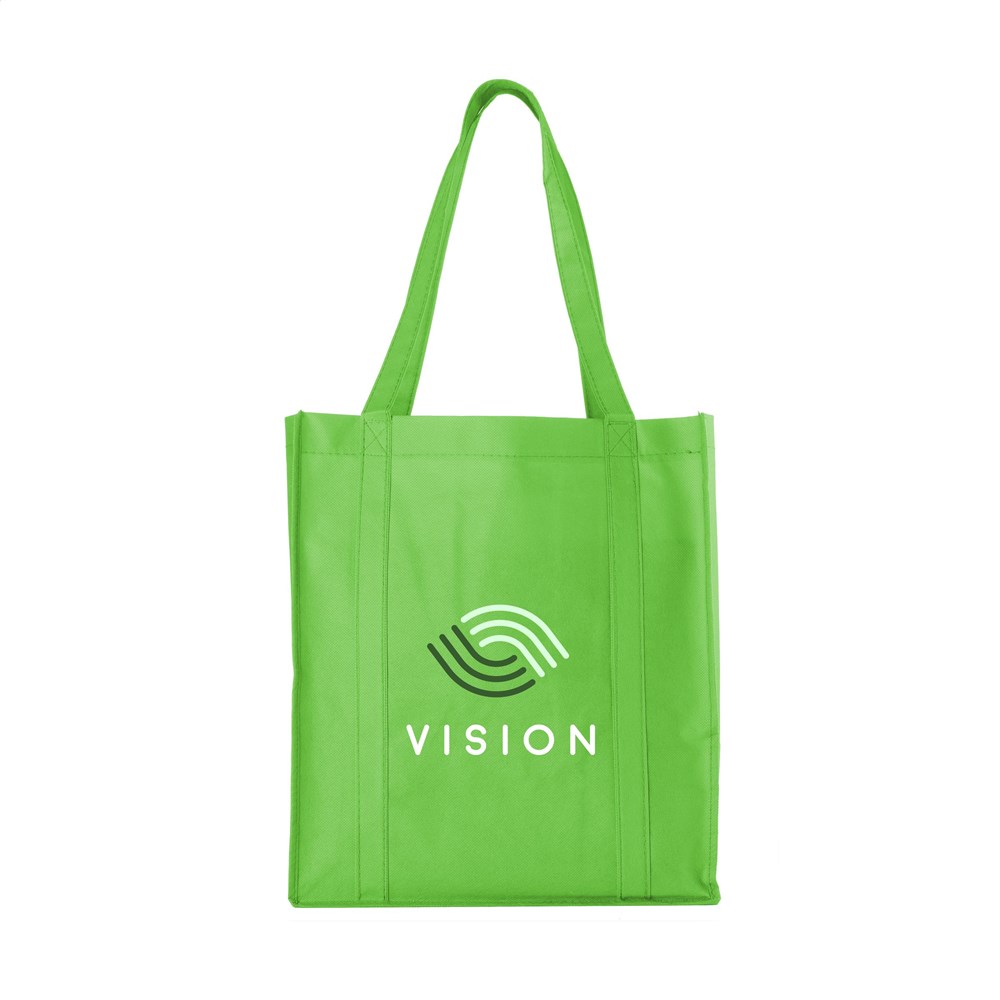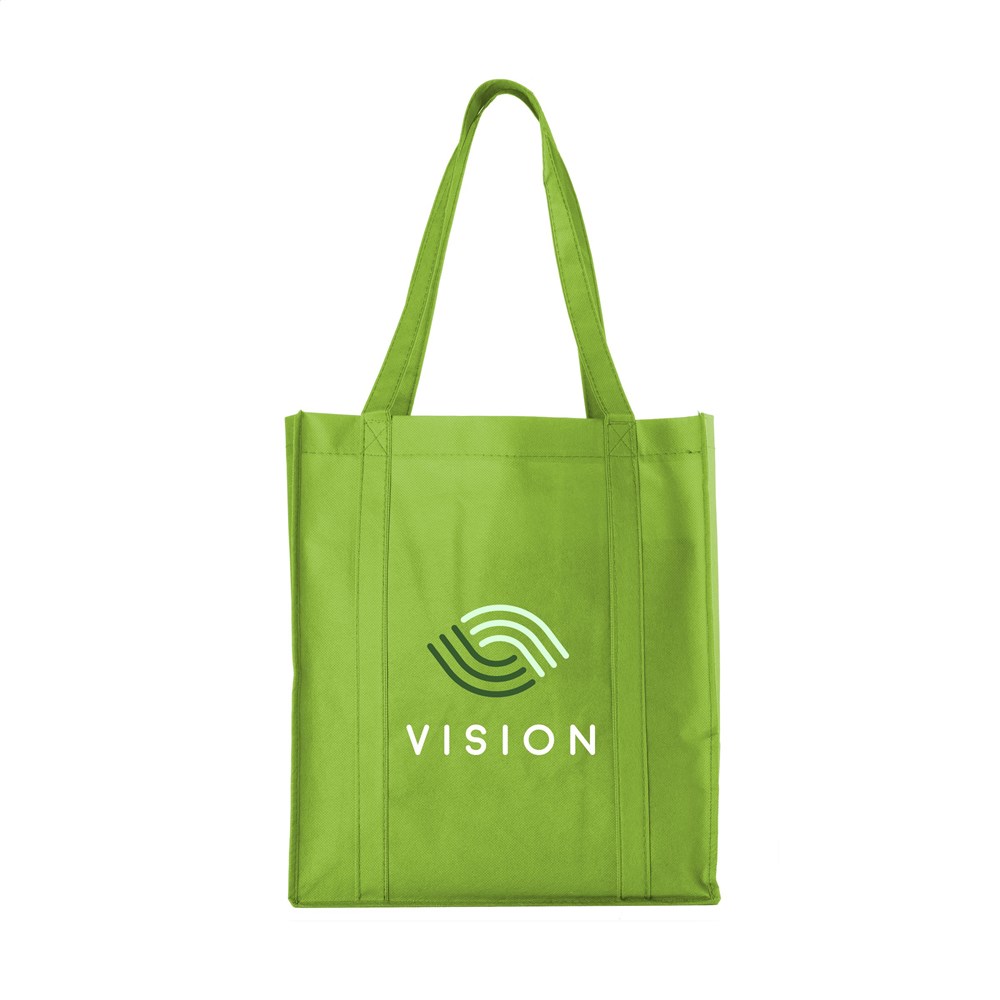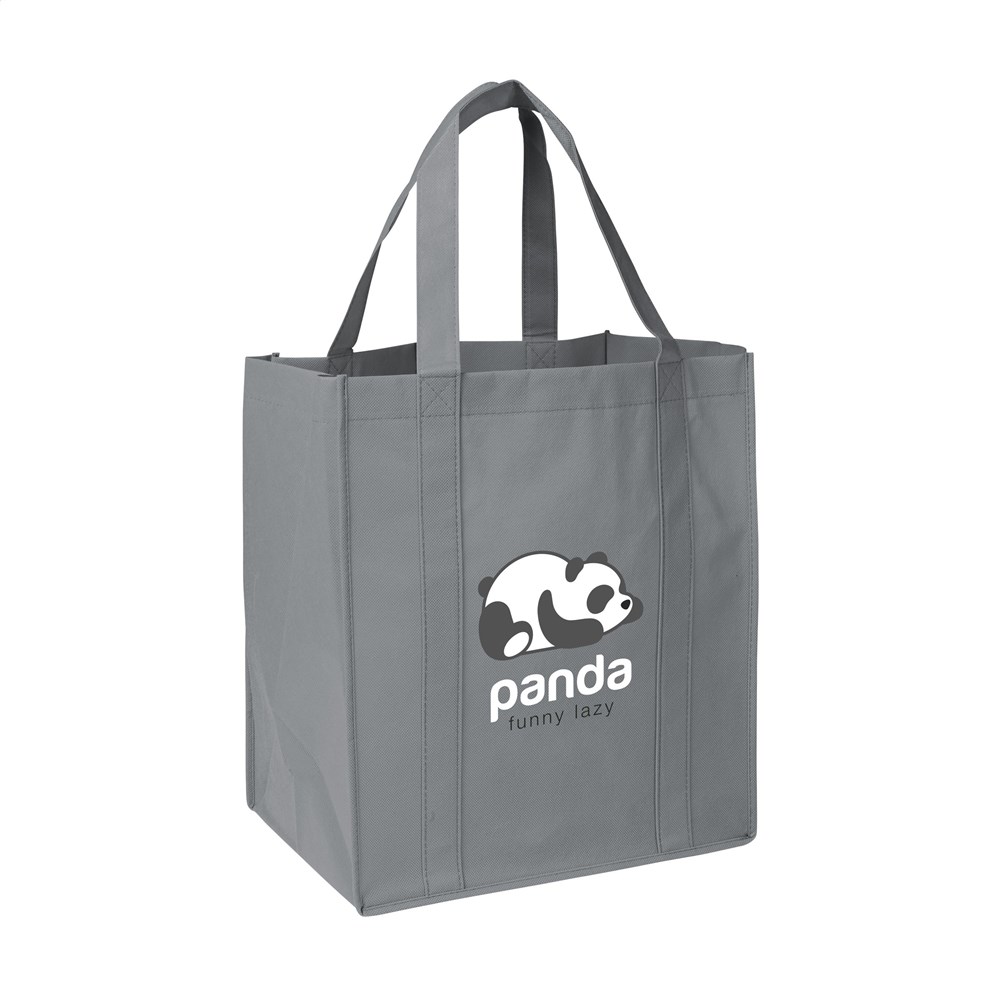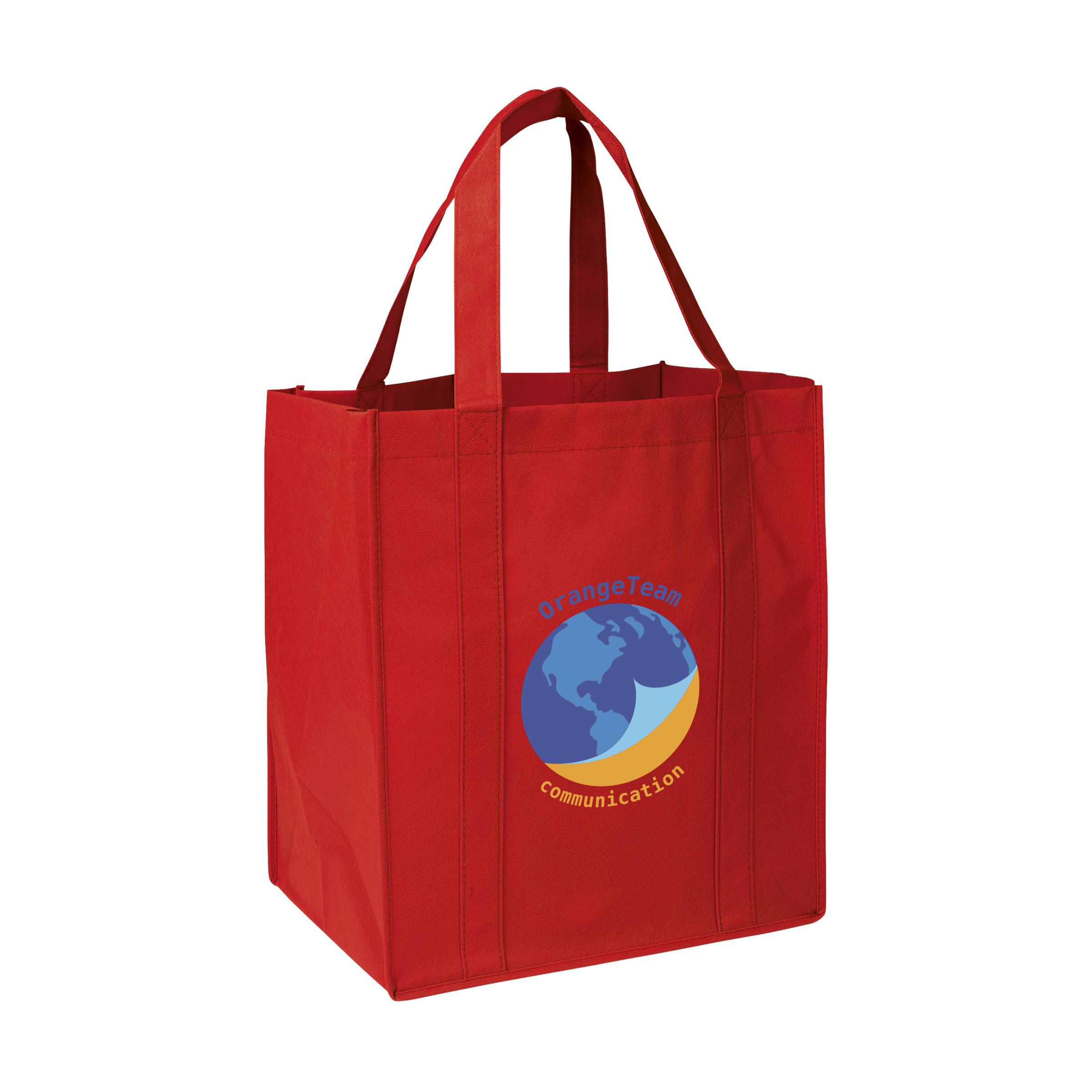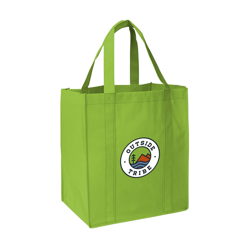 Praktische, extra ruime nonwoven (80 g/m²) winkeltas: een superlichte en sterke kunstvezelstof. Met verstevigde bodem, draaglussen en extra ophanglus aan binnenzijde.
