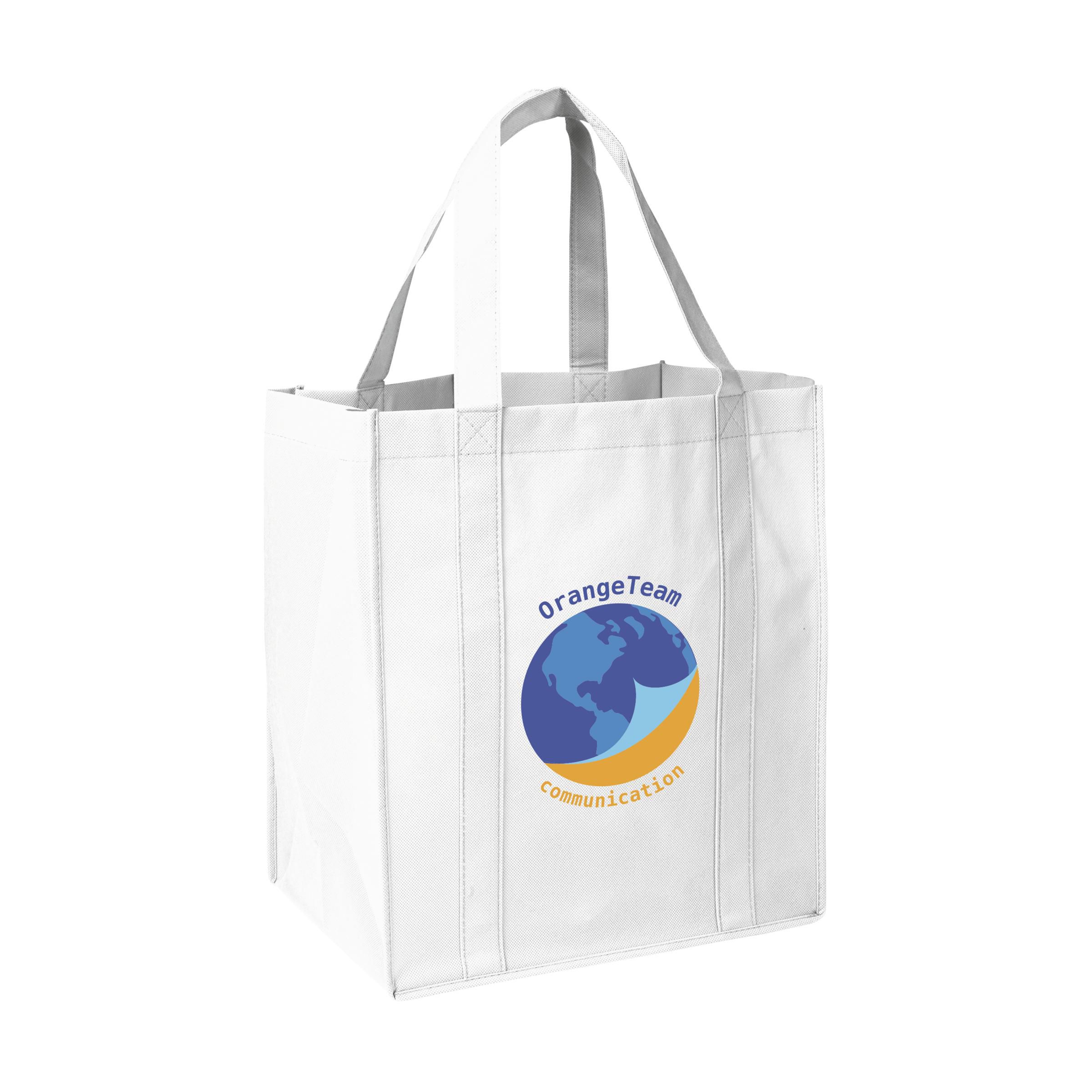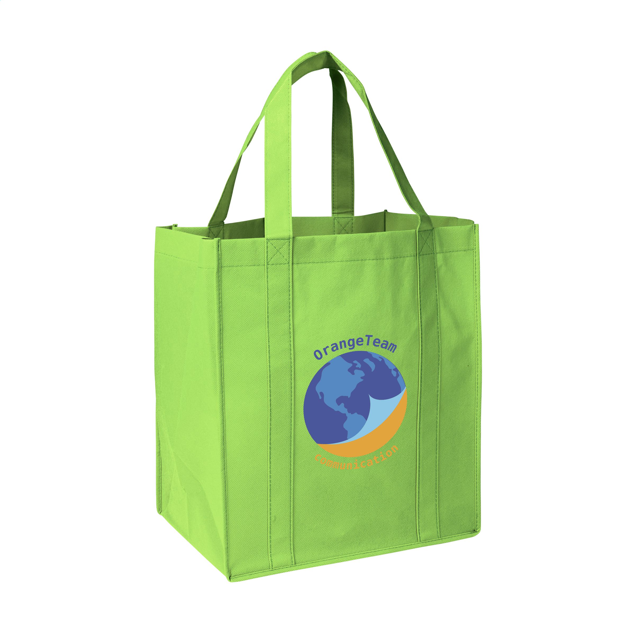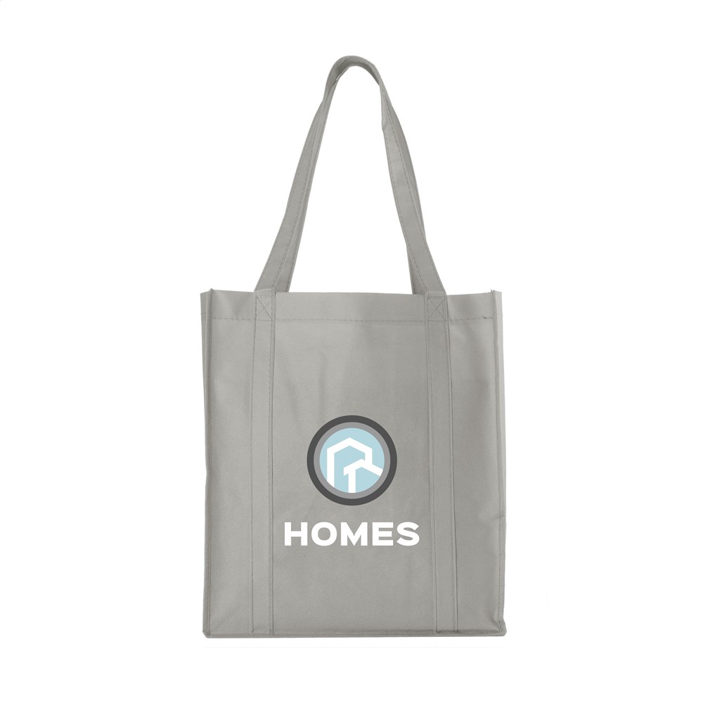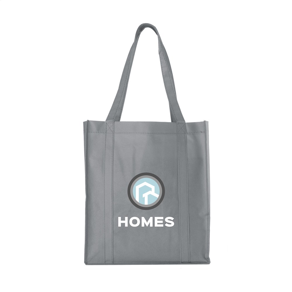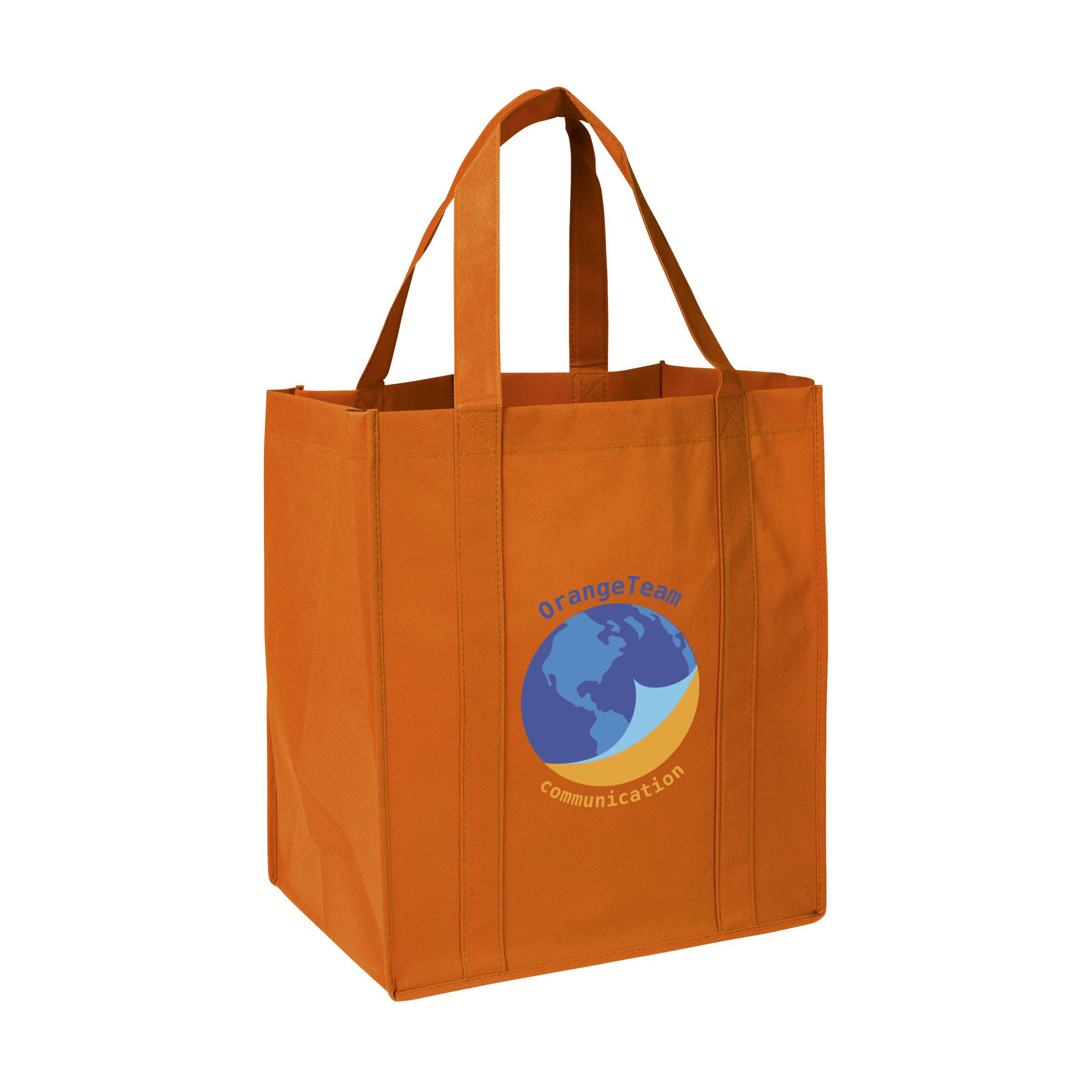 Praktische, extra ruime nonwoven (80 g/m²) winkeltas: een superlichte en sterke kunstvezelstof. Met verstevigde bodem, draaglussen en extra ophanglus aan binnenzijde.