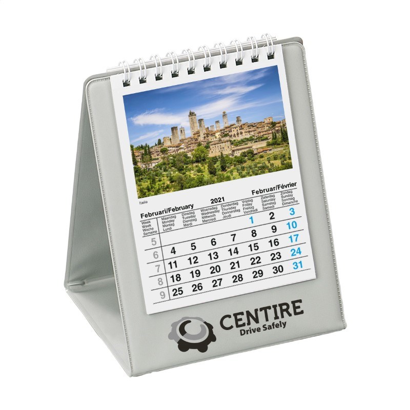 Viertalige bureaukalender: NL, EN, F en D met elke maand een foto van een Europees landschap, aan 2 zijden zichtbaar. Met metalen wire-o-binding en jaaroverzicht van het lopende en het volgende jaar. Gemaakt van papier met een FSC-Mix keurmerk.