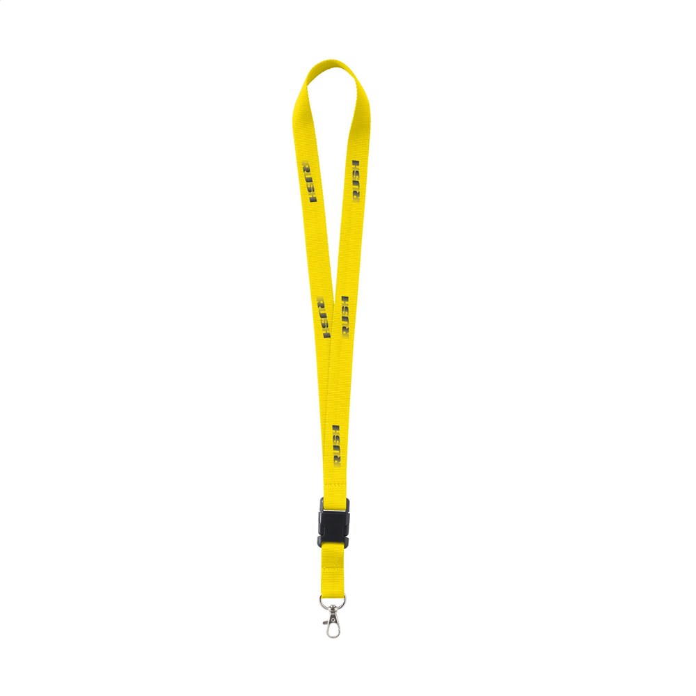 Lanyard van sterk geweven polyester met metalen karabijnhaak. Het onderste gedeelte is los te koppelen d.m.v. een kunststof kliksysteem.