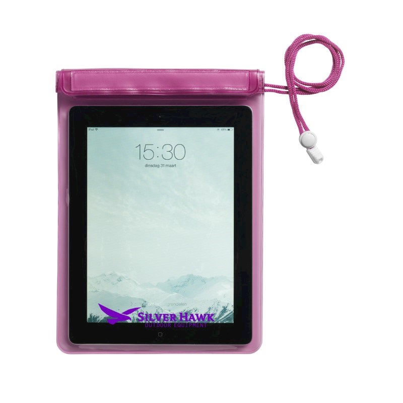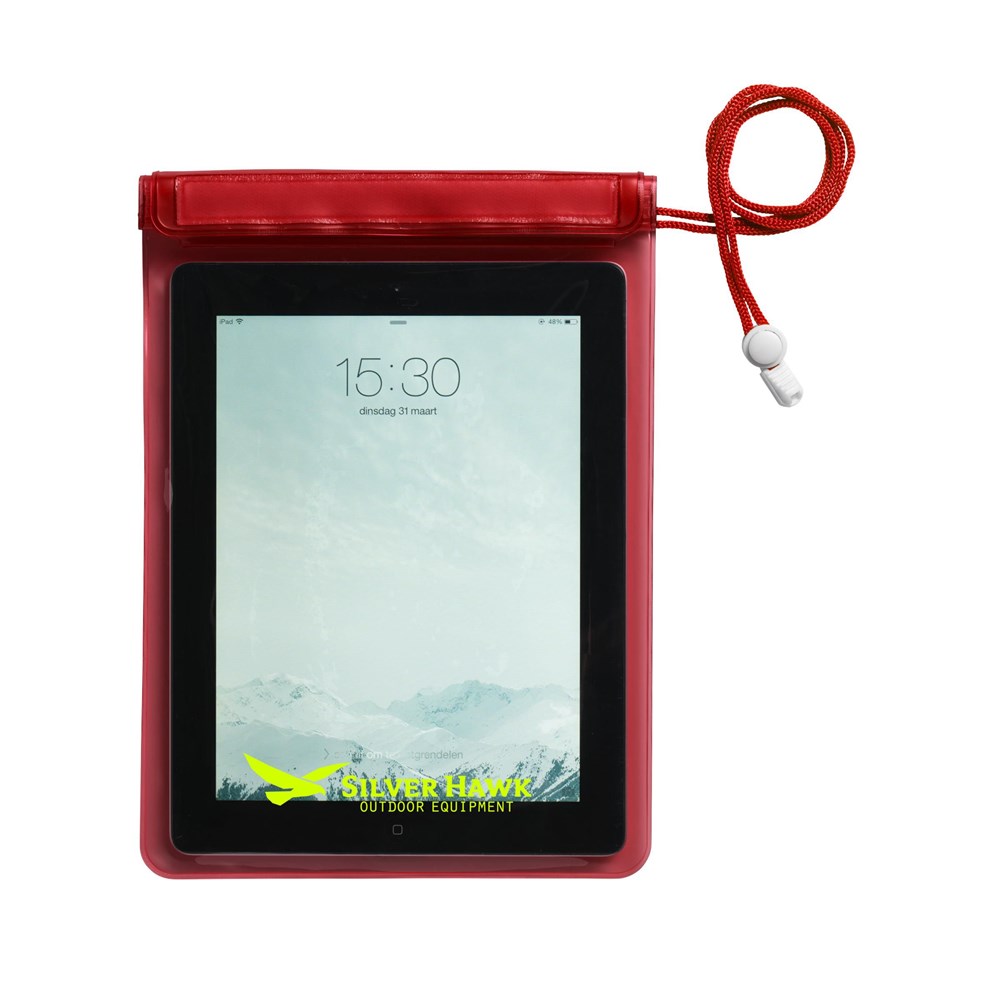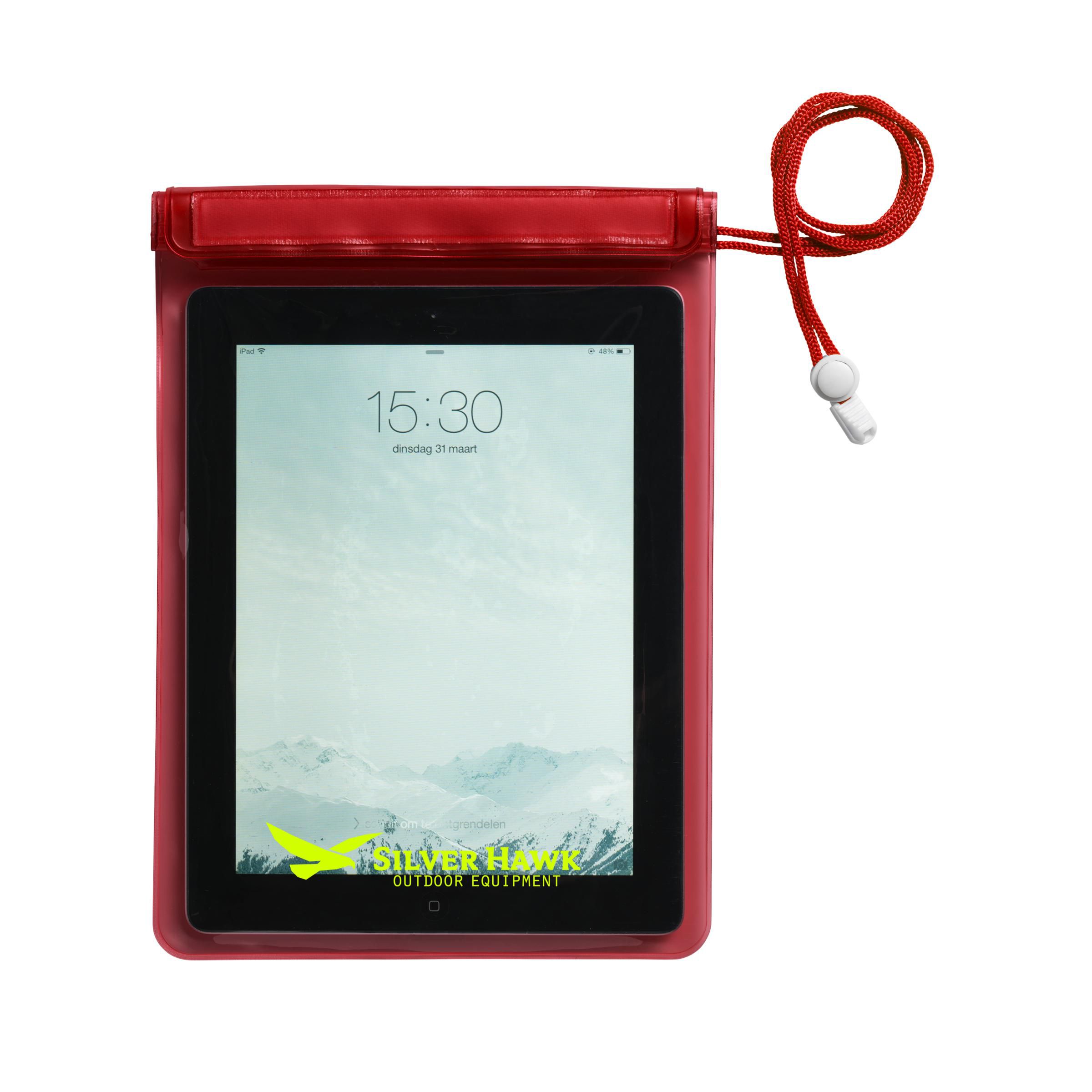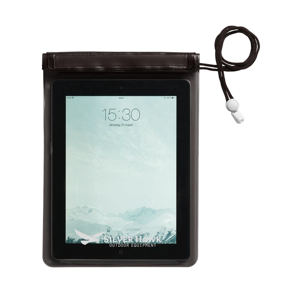 Waterdichte hoes van sterk PVC voor het veilig opbergen van een tablet tot 10 inch. Met driedubbele, extra beveiligde kliksluiting, klittenbandsluiting en omhangkoord. Beschermt de tablet en belangrijke documenten tegen water en sneeuw.
