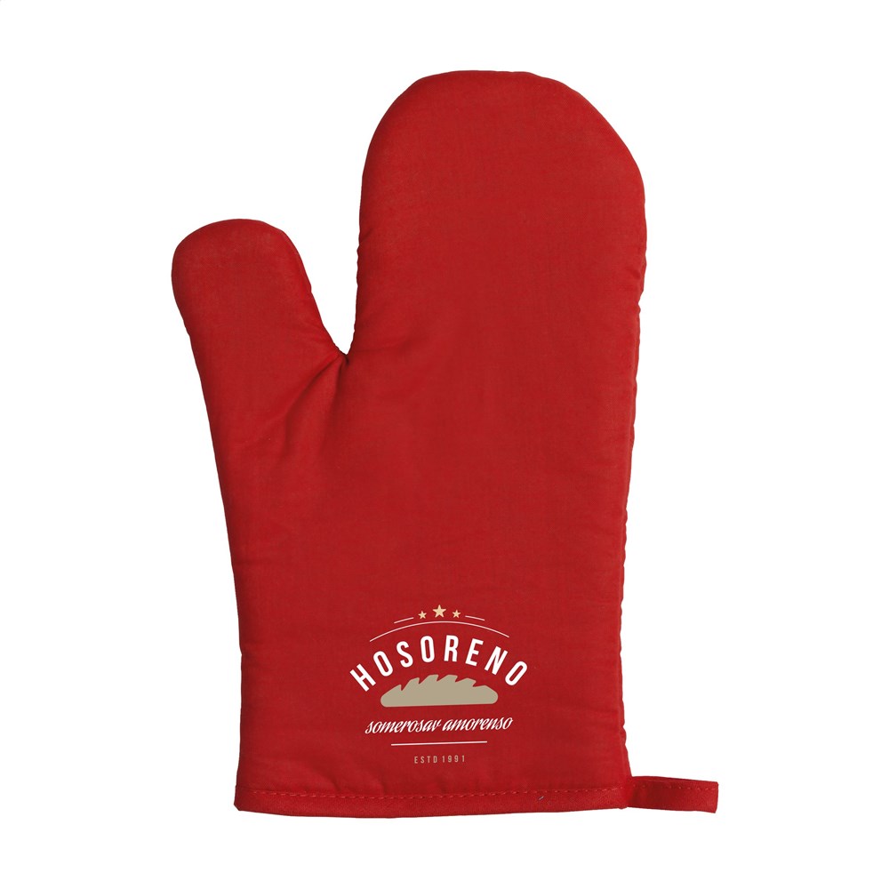 Stevige en dikke ovenwant van 100% katoen. Gewatteerd en gevoerd met molton, aan één zijde doorgestikt en voorzien van een ophanglus.