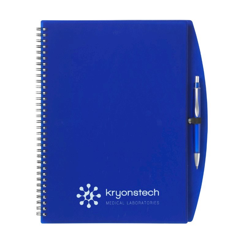 Notitieboek met ca. 70 velletjes gelinieerd schrijfpapier en transparant kunststof omslag, gebonden in metalen wire-o-binding. Incl. blauwschrijvende balpen.