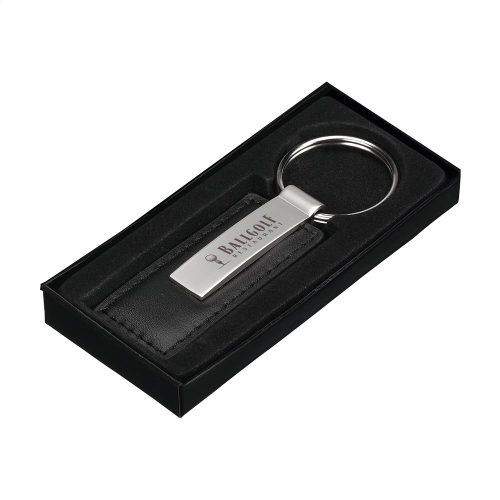 Matmetalen/imitatieleren sleutelhanger met stevige sleutelring. Per stuk in doosje.