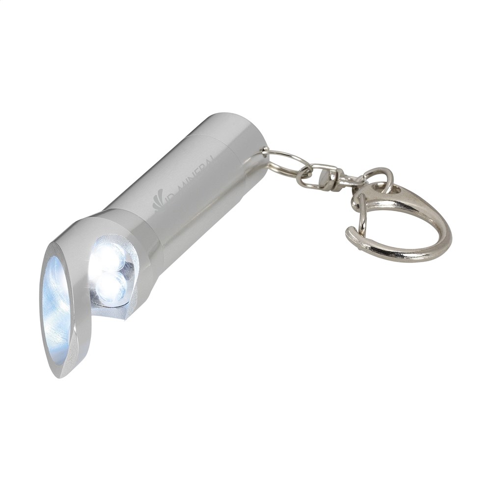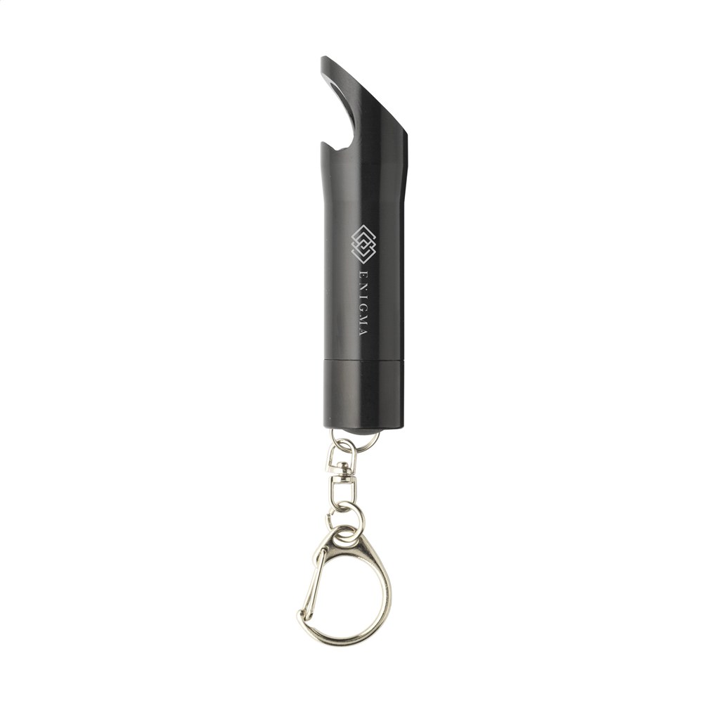 Aluminium staaflampje met 3 felwitte, energiezuinige LED-lampjes en flesopener. Aan karabijnhaak. Incl. celbatterijen. Per stuk in doosje.