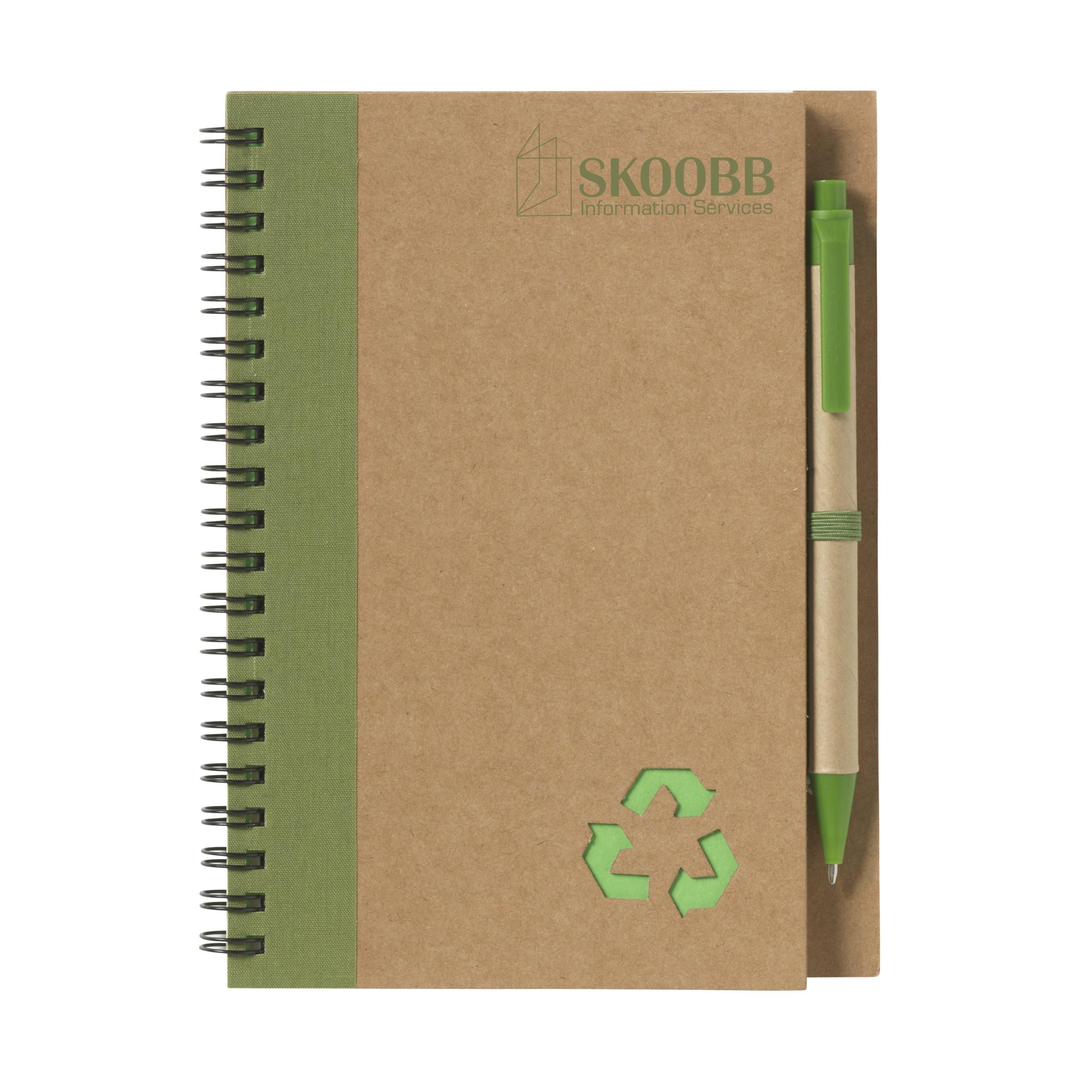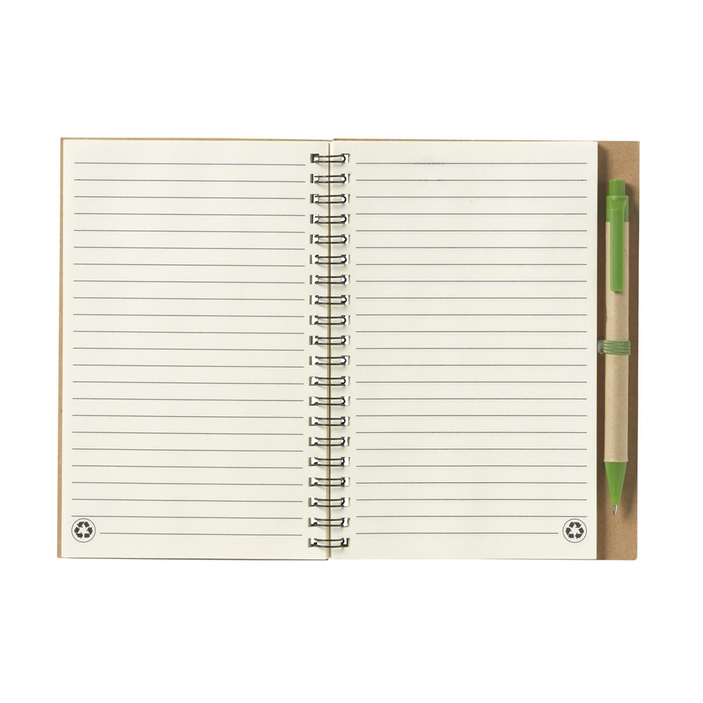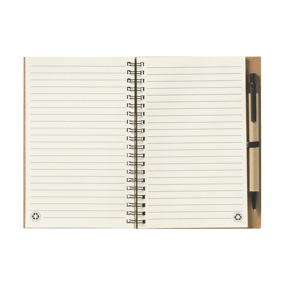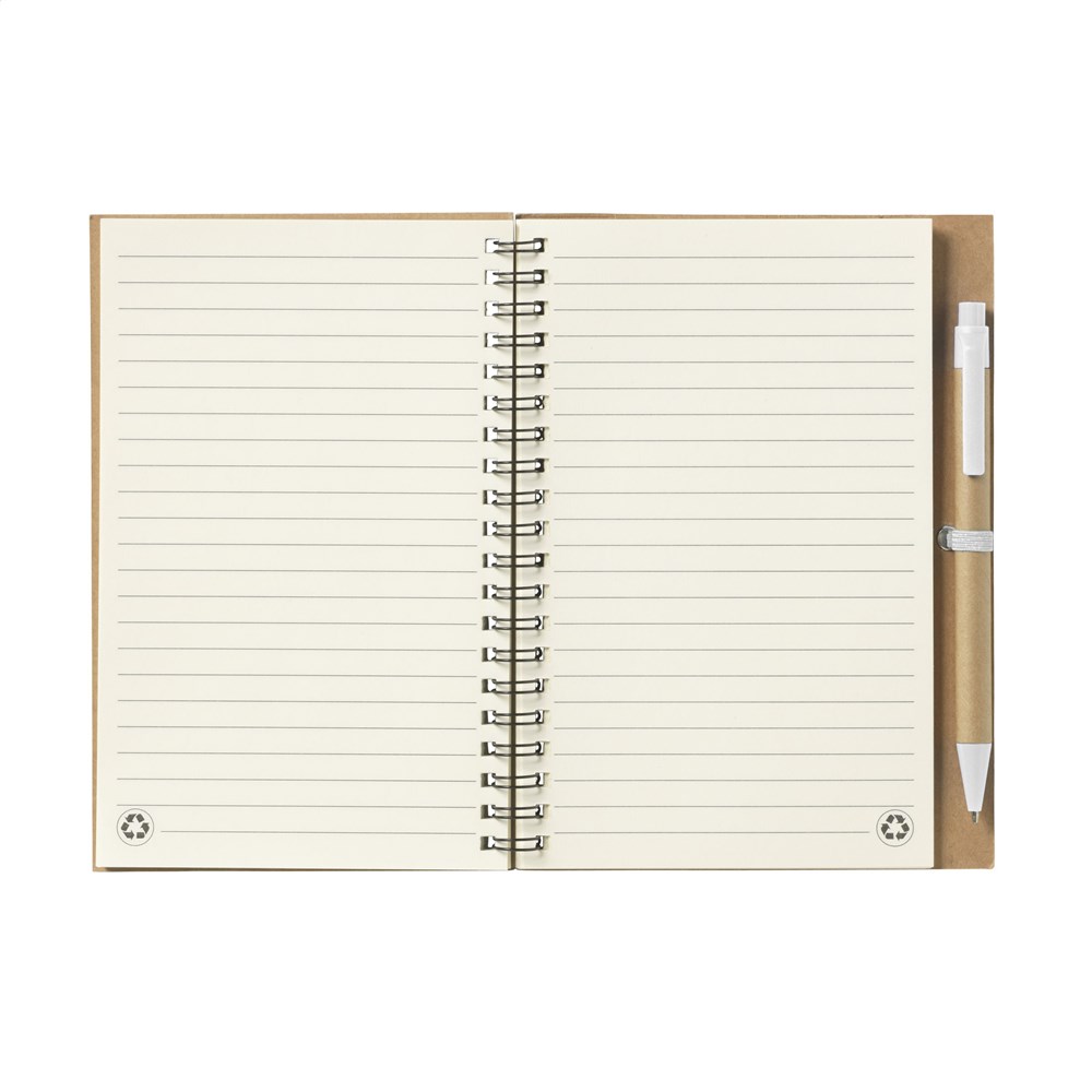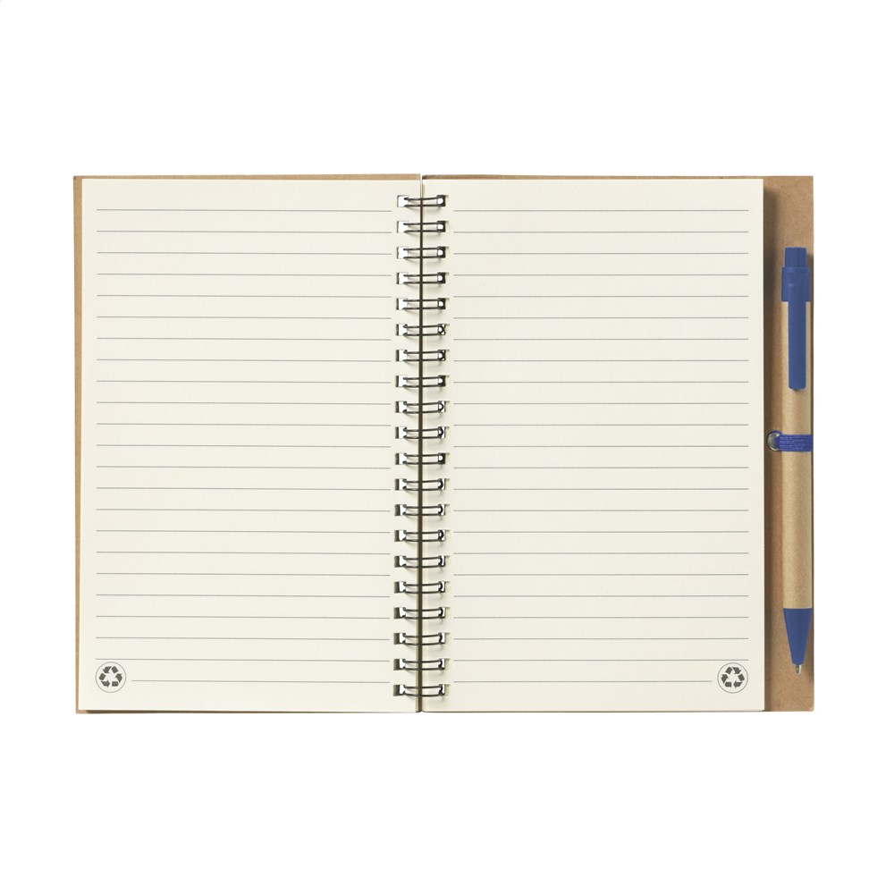 Milieuvriendelijk notitieboekje van gerecycled materiaal met ca. 70 vel crèmekleurig gelinieerd papier, kartonnen omslag. Gebonden in een sterke, metalen wire-o-binding. Incl. blauwschrijvende balpen.