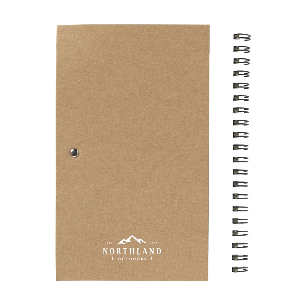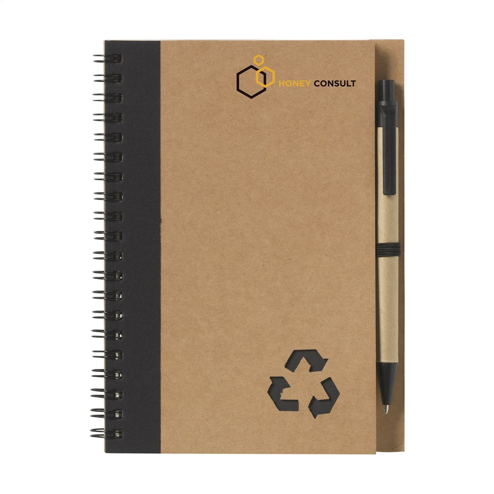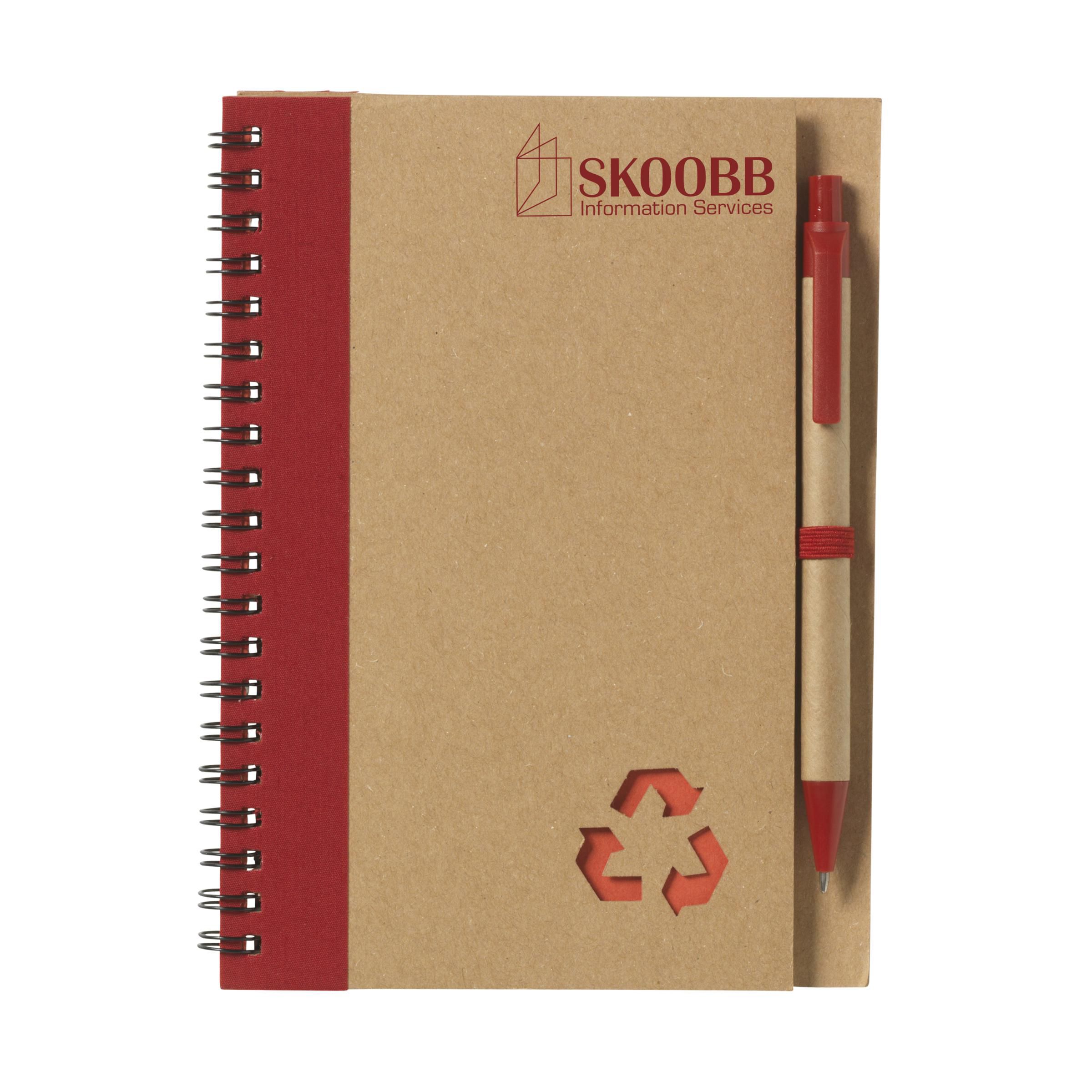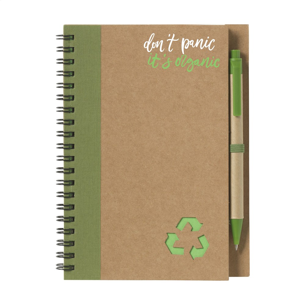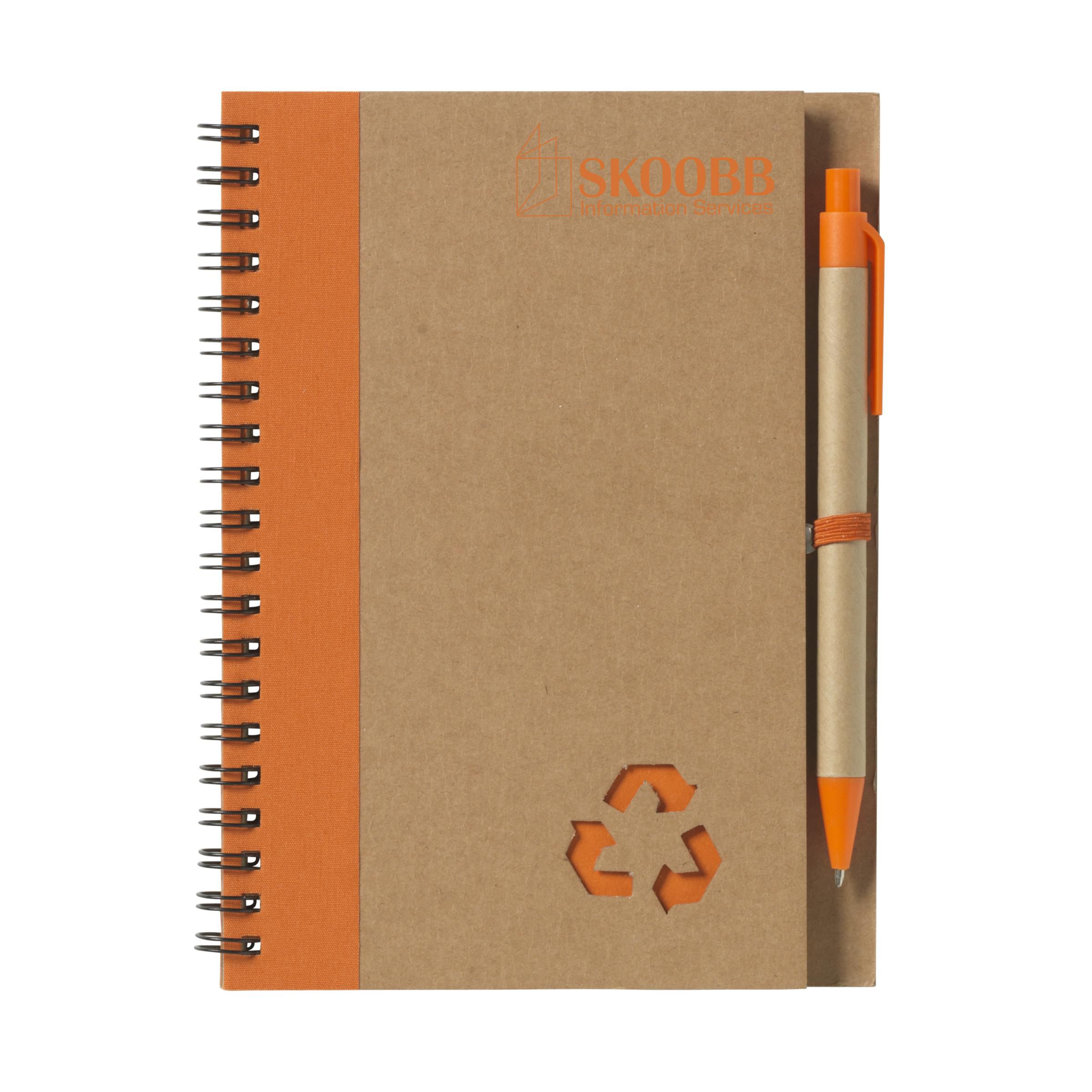 Milieuvriendelijk notitieboekje van gerecycled materiaal met ca. 70 vel crèmekleurig gelinieerd papier, kartonnen omslag. Gebonden in een sterke, metalen wire-o-binding. Incl. blauwschrijvende balpen.