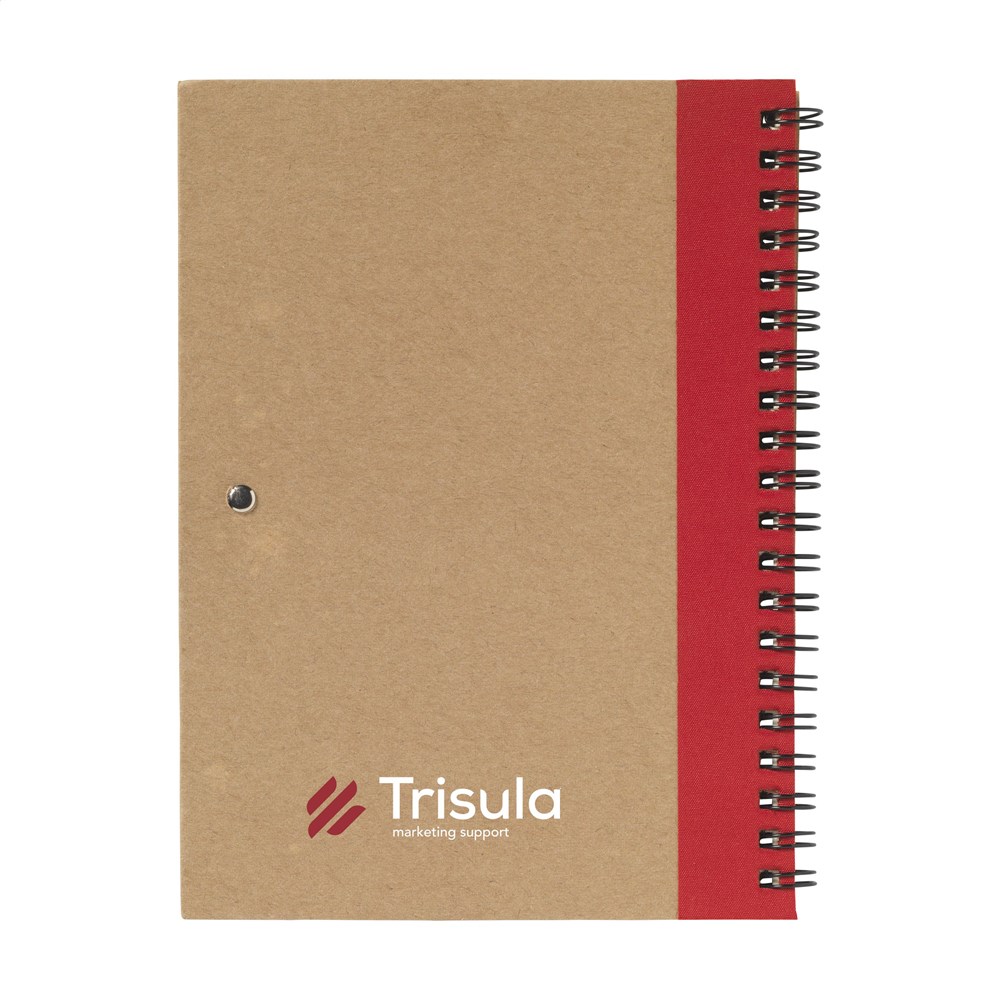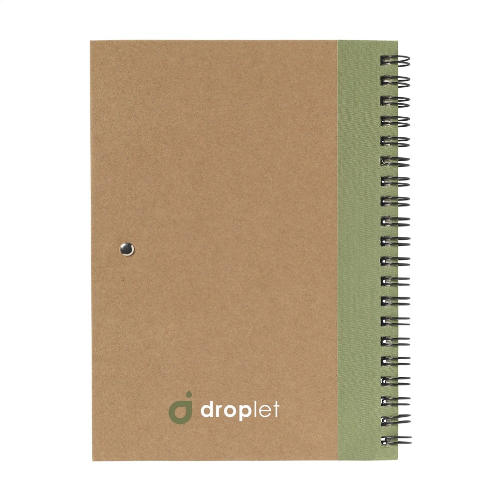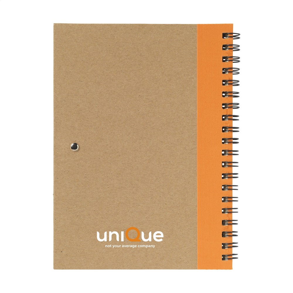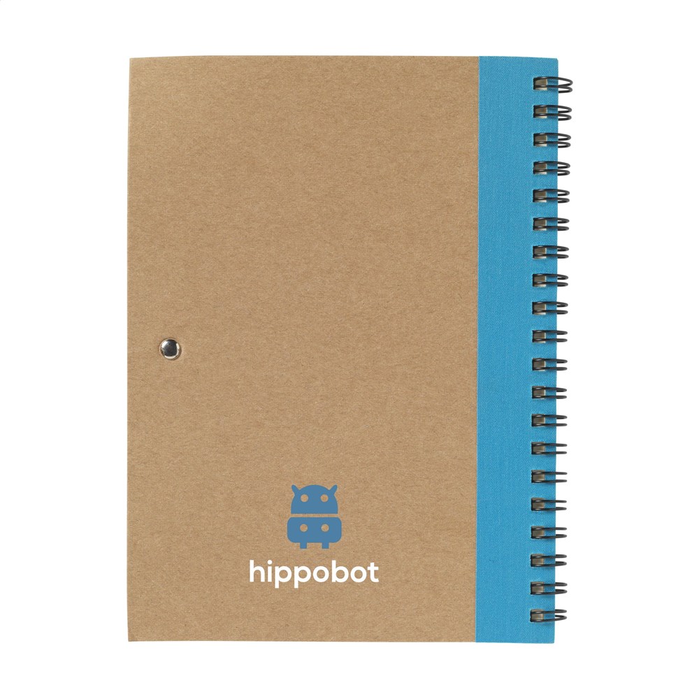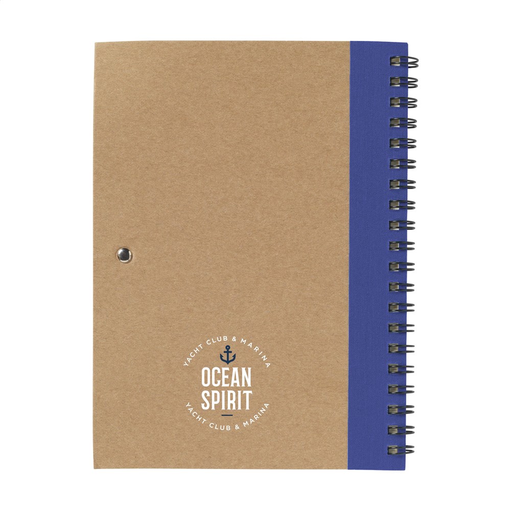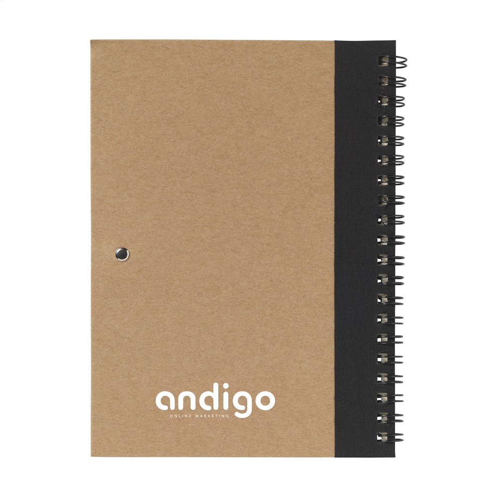 Milieuvriendelijk notitieboekje van gerecycled materiaal met ca. 70 vel crèmekleurig gelinieerd papier, kartonnen omslag. Gebonden in een sterke, metalen wire-o-binding. Incl. blauwschrijvende balpen.