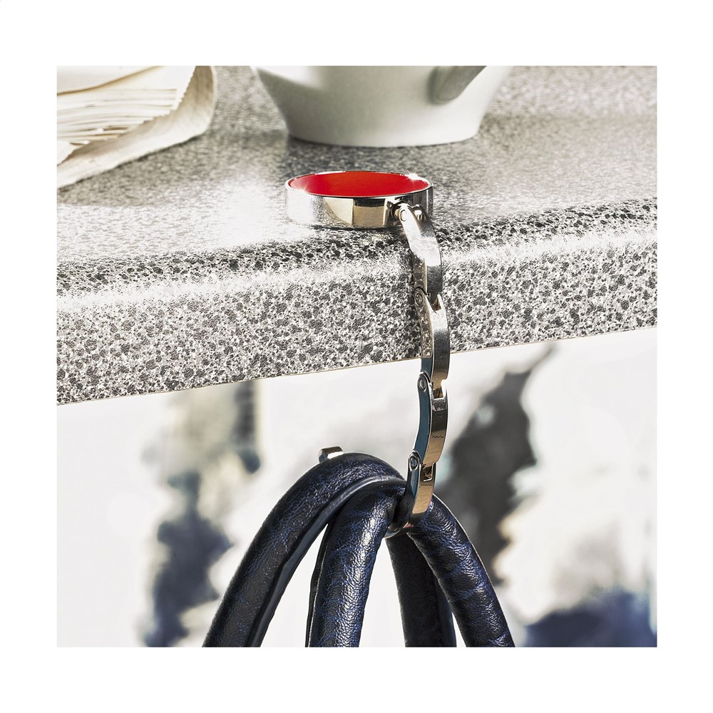 Opvouwbare tassenhaak met antislip. Per stuk in doosje.