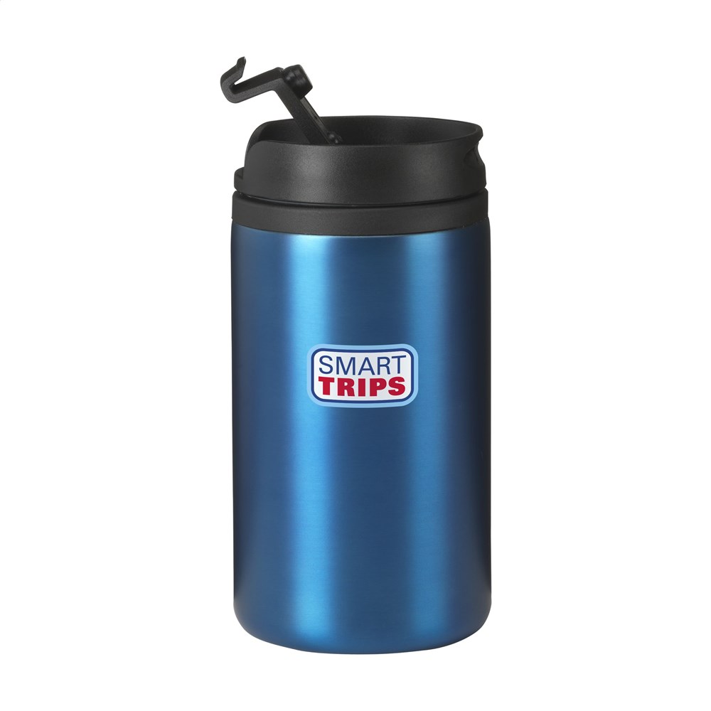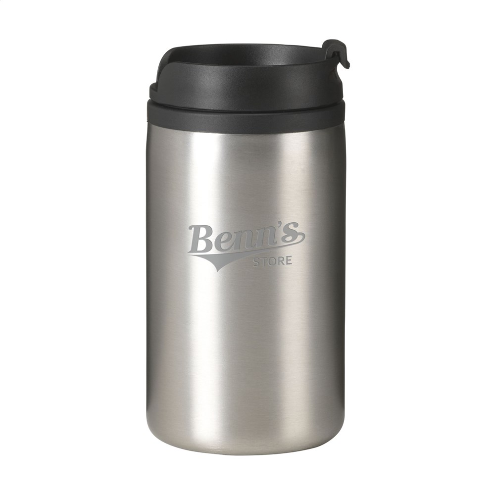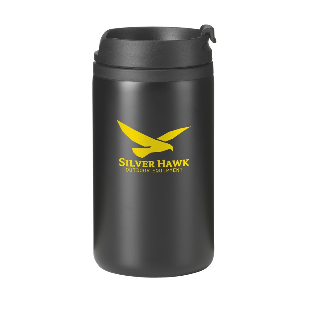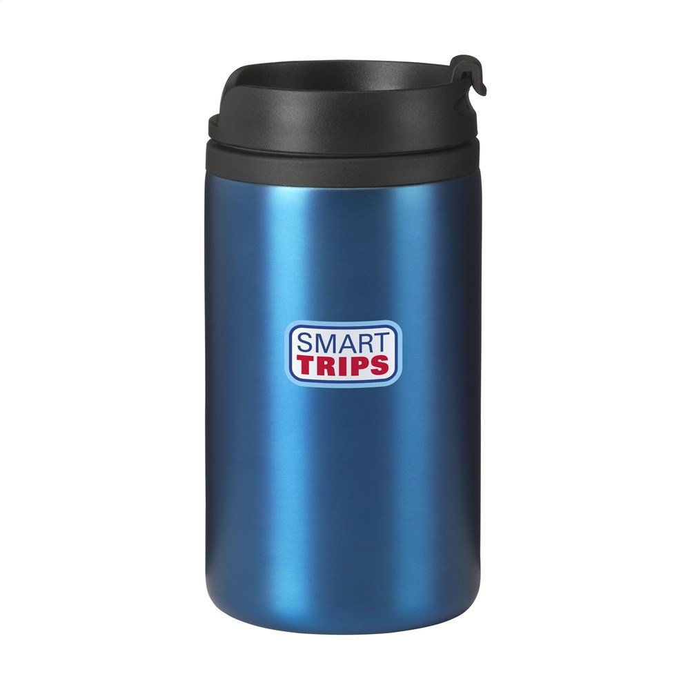 Dubbelwandige thermosbeker met RVS buitenwand en kunststof binnenwand, schroefdeksel met klikopening en slipvaste onderzijde. Lekvrij. Inhoud 300 ml. Per stuk in doos.