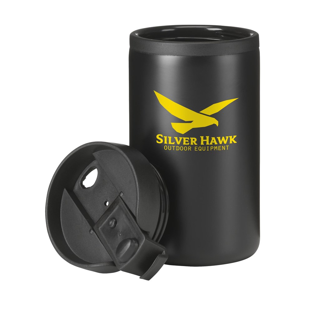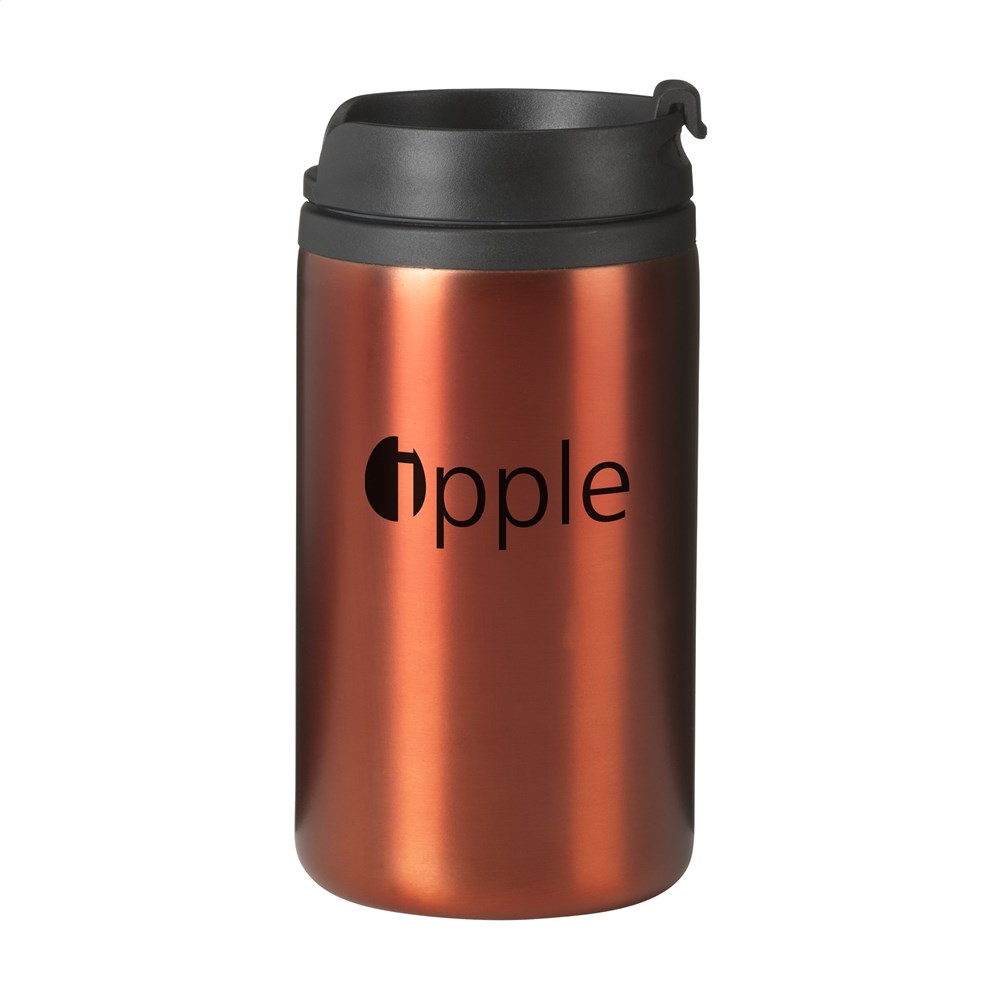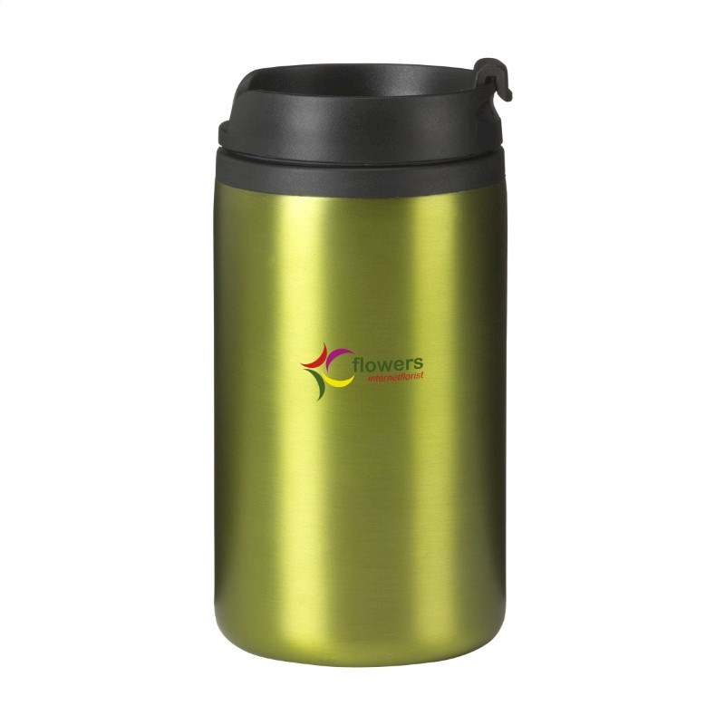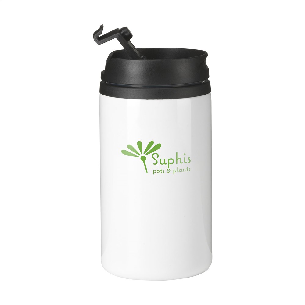 Dubbelwandige thermosbeker met RVS buitenwand en kunststof binnenwand, schroefdeksel met klikopening en slipvaste onderzijde. Lekvrij. Inhoud 300 ml. Per stuk in doos.