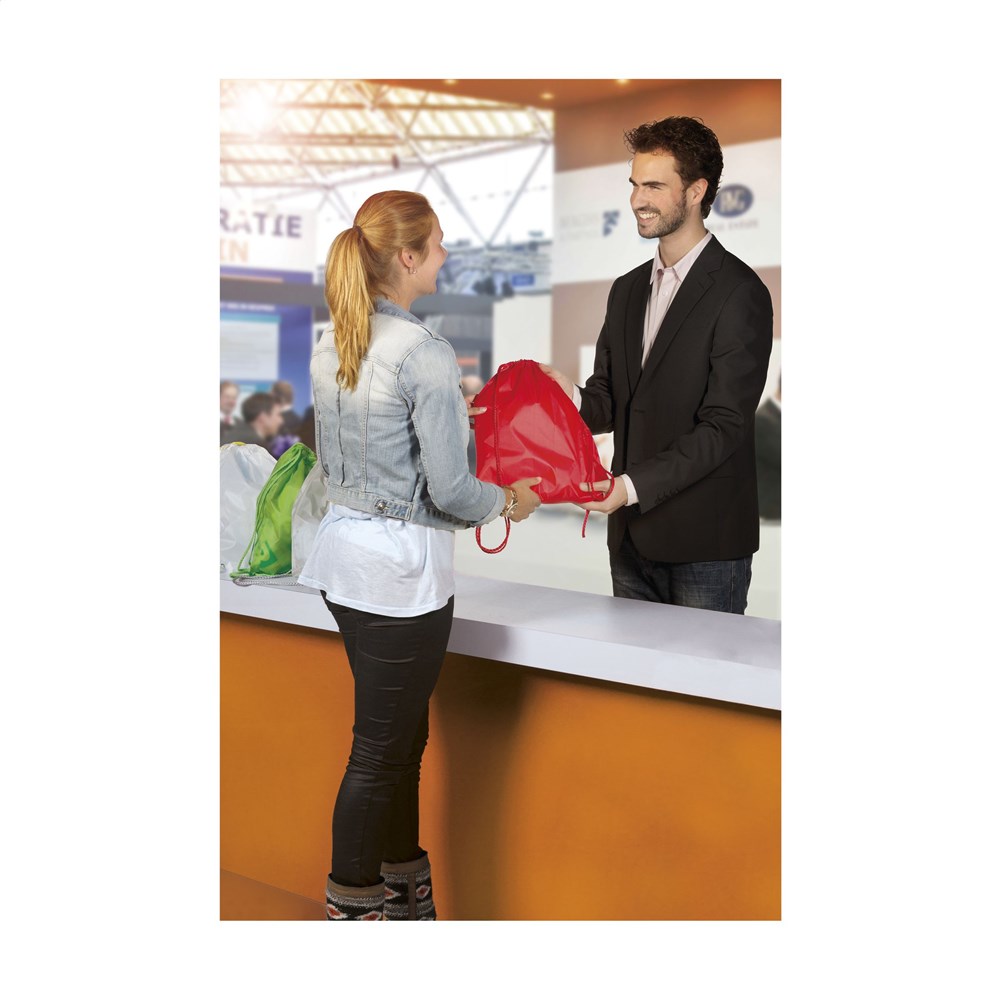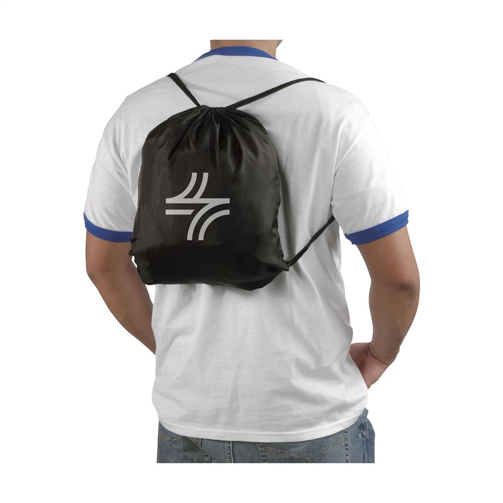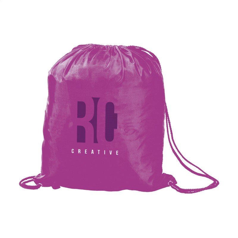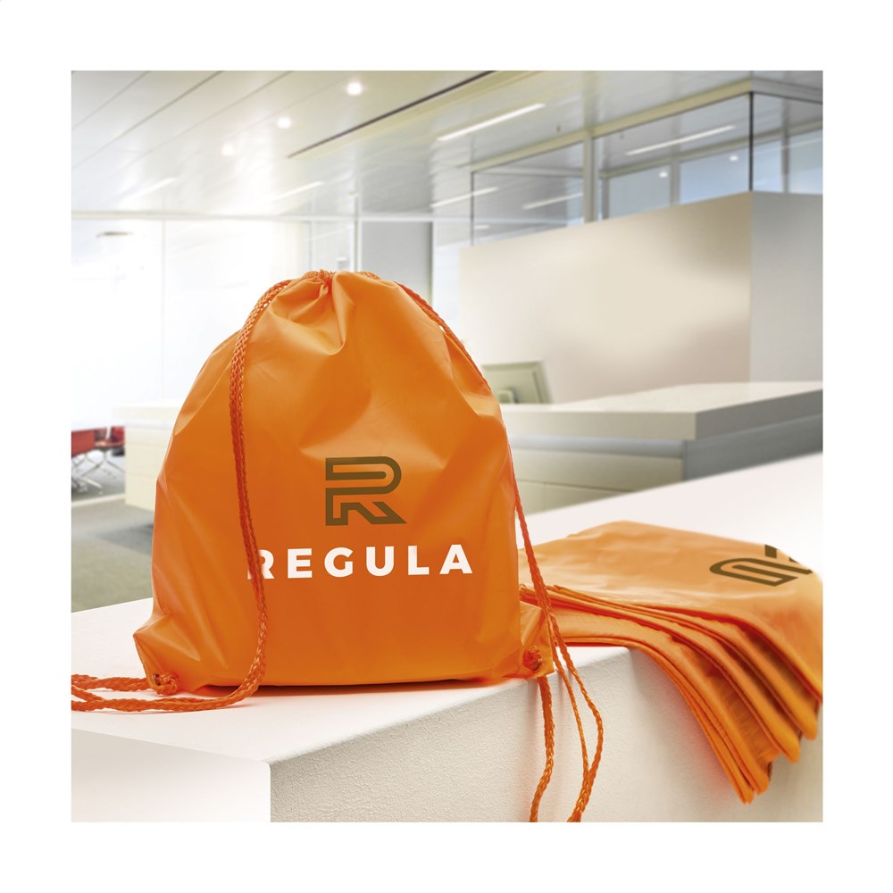 Rugzak van waterafstotend 190T polyester. Met aanrijgkoorden. Inhoud ca. 8 liter.