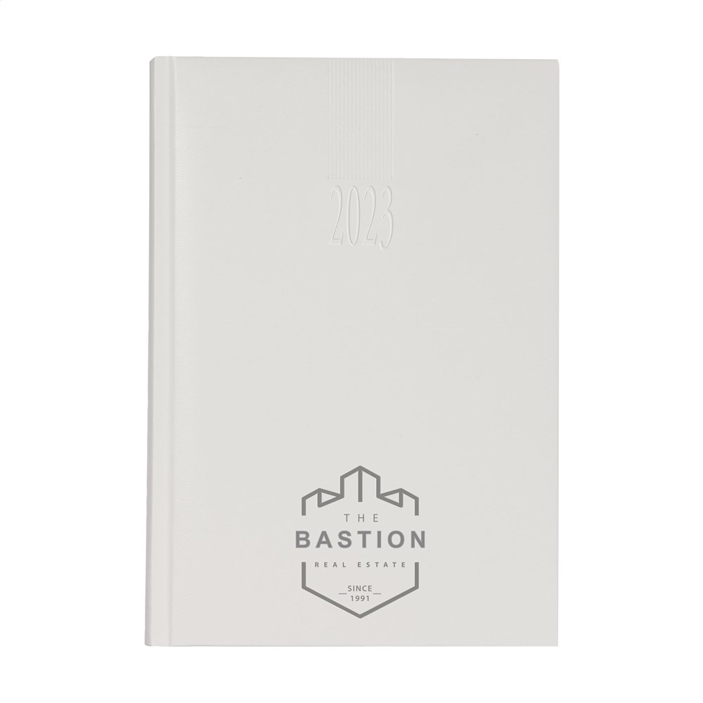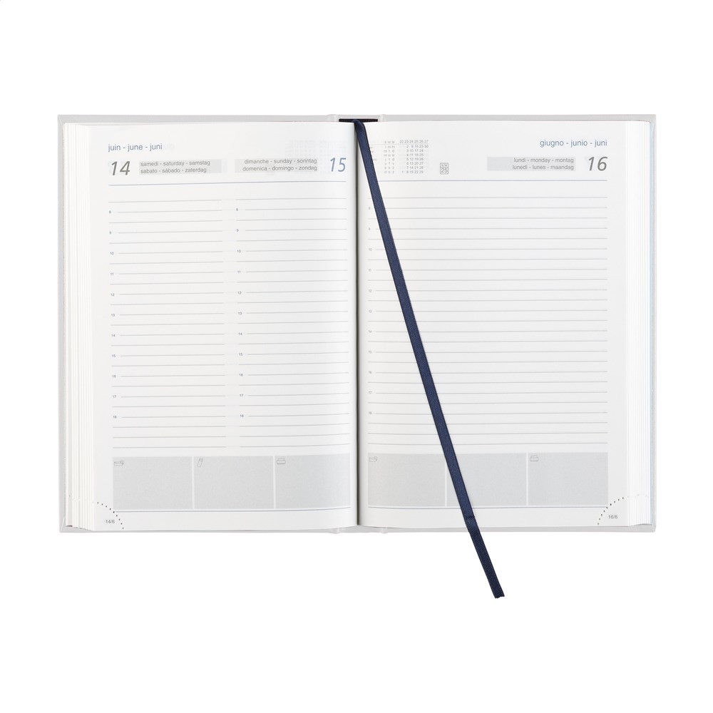 Zestalige bureau-agenda: NL, GB, F, D, I en ES. Met sterk gewatteerde, imitatieleren Balacron omslag en het jaartal in blinddruk op de voorzijde, 70 g. wit schrijfpapier, tweekleurendruk, garengebonden, hoekperforatie, één dag per pagina (zaterdag en zondag gecombineerd), jaarplanner lopende jaar en 2 kwartalen volgende jaar, notitieruimte voor elke dag, extra pagina's met handige informatie. Gemaakt van papier met een FSC-Mix keurmerk.