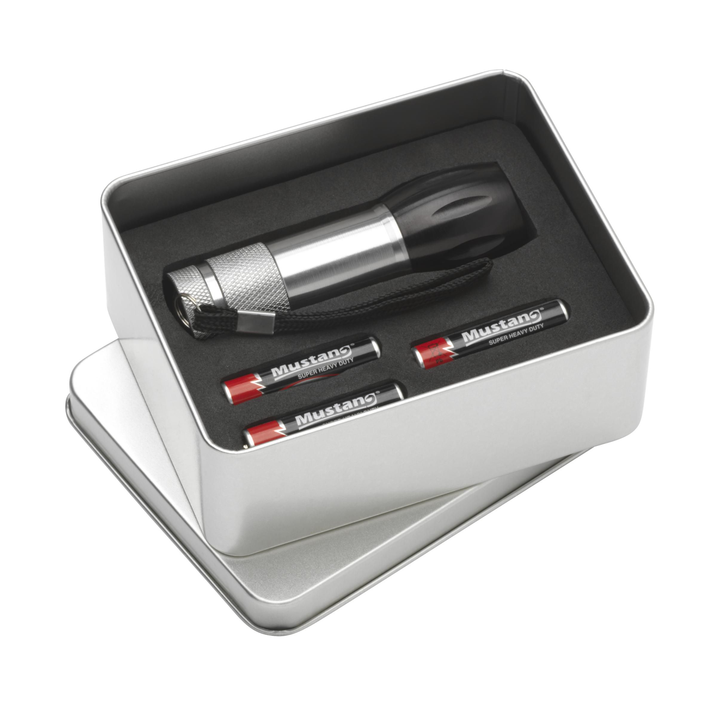 Aluminium zaklamp met 9 LED-lampjes en afneembare polsriem. Afm. Ø 2,7 x 9,7 cm. Incl. batterijen. Per stuk in geschenkblik.
