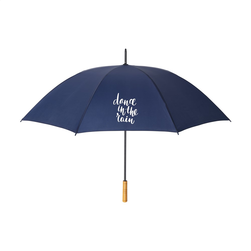 Stormparaplu met 190T nylon bespanning, een schermdoorsnede van 127 cm, metalen frame en steel, houten handgreep en klittenbandsluiting.