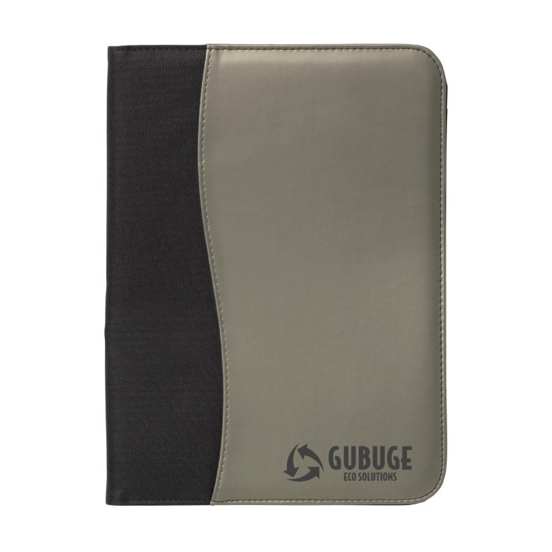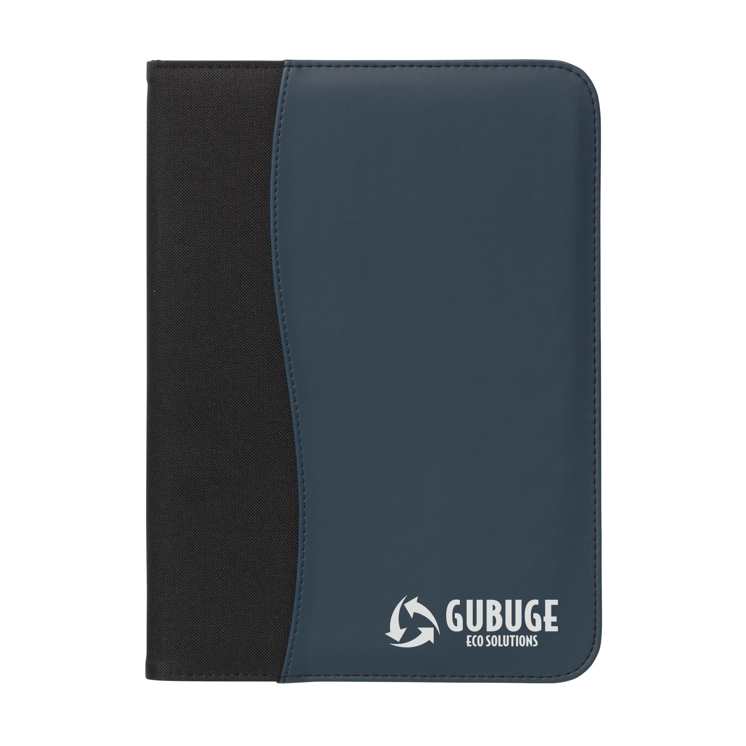 Schrijfmap/documentenmap van 600D nylon/imitatieleer in A4-formaat. Met diverse insteekvakken. Incl. schrijfblok en balpen.