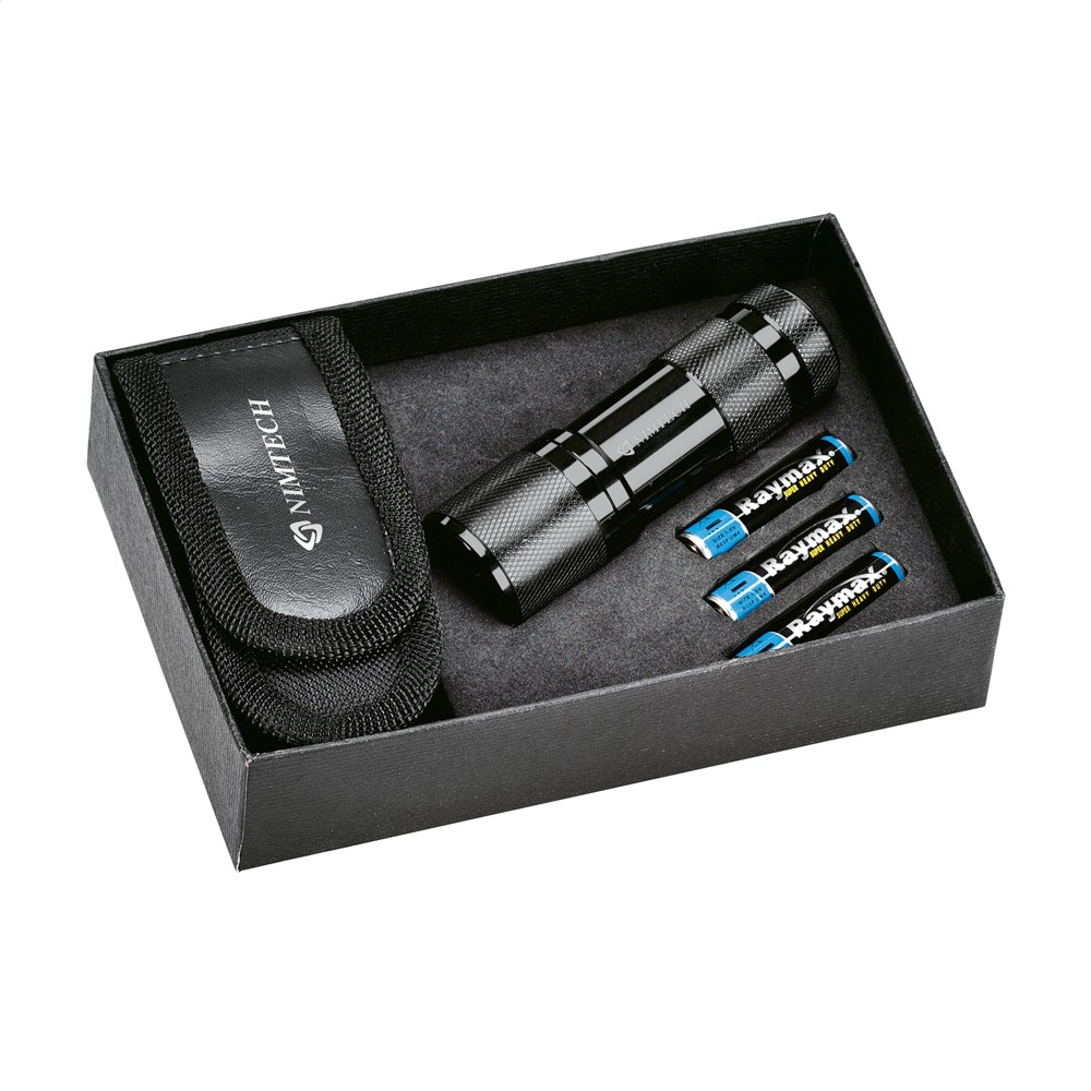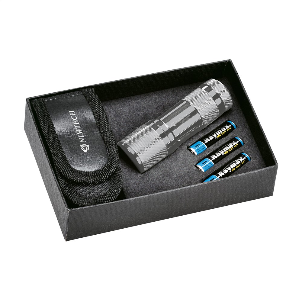 Aluminium staaflamp met felwit licht van 9 LED-lampjes. Afm. Ø 2 x 9,5 cm. Incl. batterijen, afneembare polslus en nylon etui. Per stuk in doos.