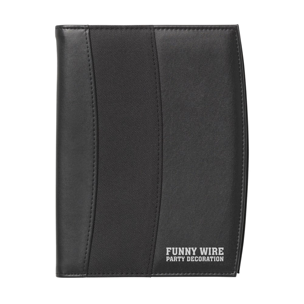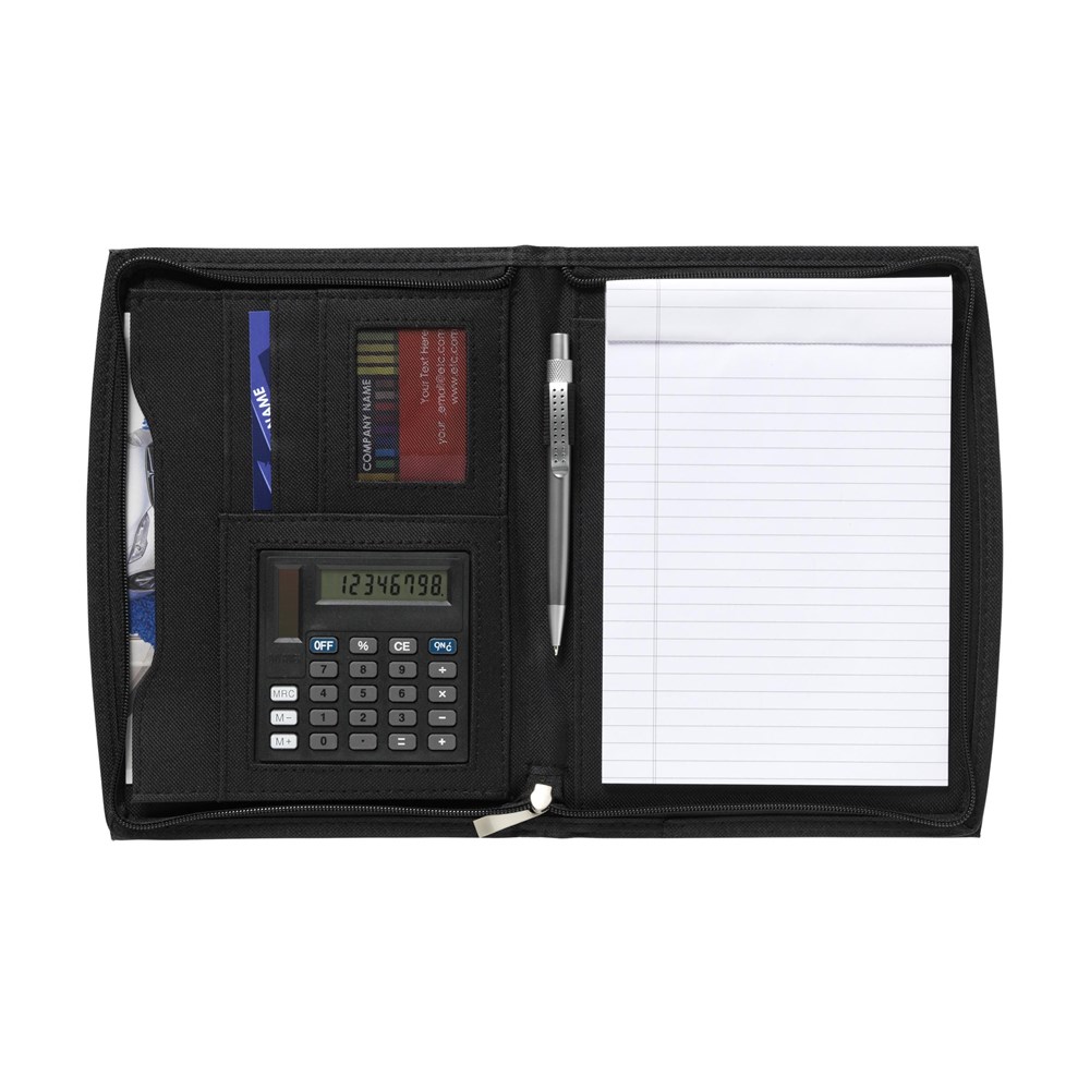 Schrijfmap/documentenmap van 600D polyester/imitatieleer in A5-formaat. Met diverse insteekvakken, uitneembare solarcalculator met dual power (incl. celbatterij) en rits rondom. Incl. schrijfblok en balpen.