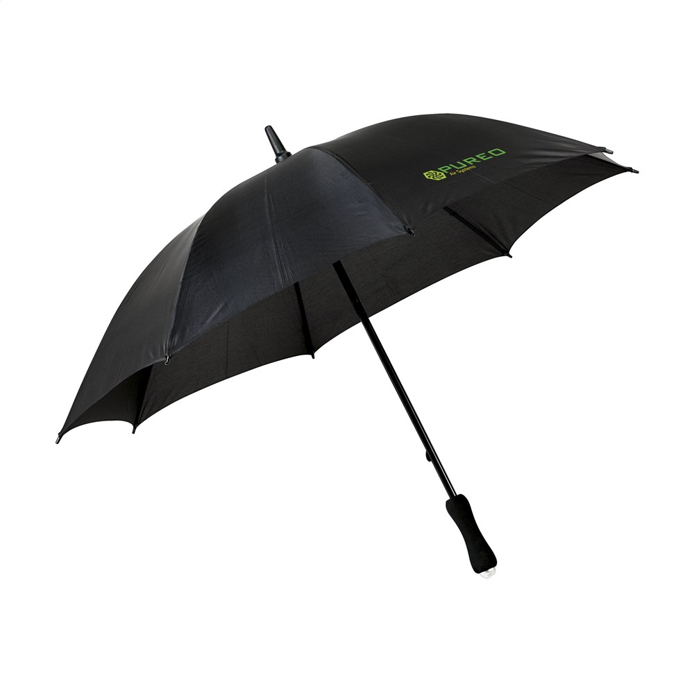 Paraplu met 190T nylon bespanning, metalen frame en steel, voorgevormde foam handgreep en klittenbandsluiting. In handige opberghoes met schouderriem.