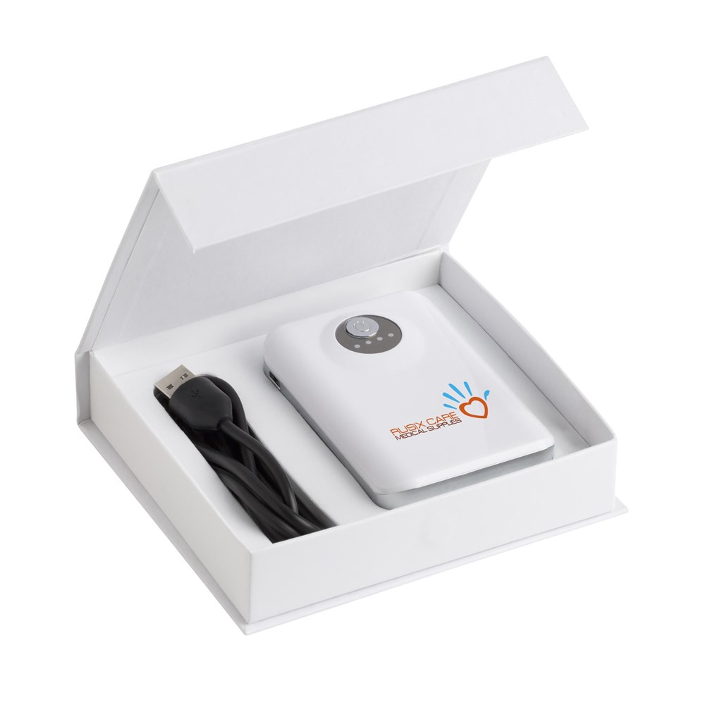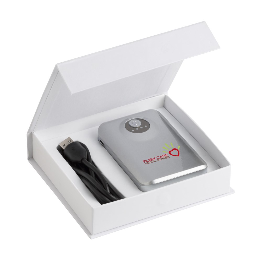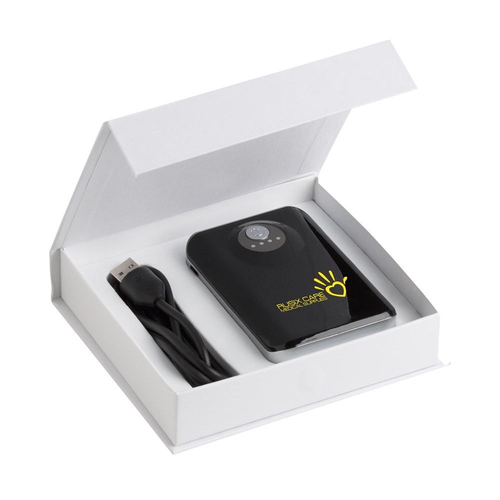Zeer krachtige, hoge capaciteit kunststof powerbank met • oplichtende batterij-indicator • zaklampfunctie • 2 output poorten voor het tegelijk laden van meerdere mobiele apparaten • ingebouwde lithium batterij (6600mAh/3.7V). Input: 5V-1A. Output: Poort 1: 5V-1A. Poort 2: 5V-2.1A. Voor het opladen van uw smartphone, tablet, digitale camera, GPS of muziekdrager. Handig voor onderweg, vakantie, zakenreizen, festivals, een dagje uit en eigenlijk al die momenten waarop je mobiele apparaat wel wat extra energie kan gebruiken, maar er geen stopcontact voorhanden is. De powerbank voldoet aan de Europese richtlijnen en wordt geleverd inclusief usb/micro-usb oplaadkabel, A-kwaliteit lithium batterij en meertalige gebruiksaanwijzing. Wanneer je het vermogen van de powerbank (mAh) deelt door het vermogen van de batterij in je mobiele apparaat (mAh), weet je ongeveer voor hoeveel procent of hoe vaak je jouw mobiele apparaat kunt opladen. Per stuk in luxe geschenkdoos met magneetsluiting.